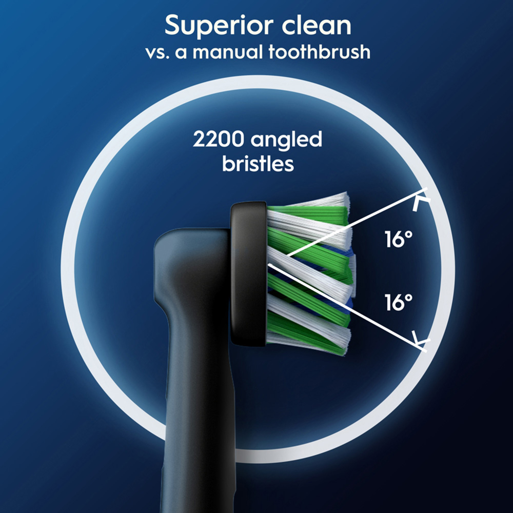 Make a compact and functional addition to your oral hygiene routine with the Oral-B Cross Action Black X-Filaments Replacement Head 4 Pack. These toothbrush heads feature more than 2200 perfectly angled bristles to remove up to 100% more bacterial plaque for cleaner teeth and healthier gums compared to a manual toothbrush. These genuine brush heads are designed with unique 16° angled bristles and X-shape bristles that clean in areas that round ones cannot reach. Its brush head usage indicator turns bristles from green to yellow showing you when to change for 100% cleaning efficacy. It ensures a guaranteed fit with Oral-B electric rechargeable toothbrushes except Pulsonic and iO toothbrushes.