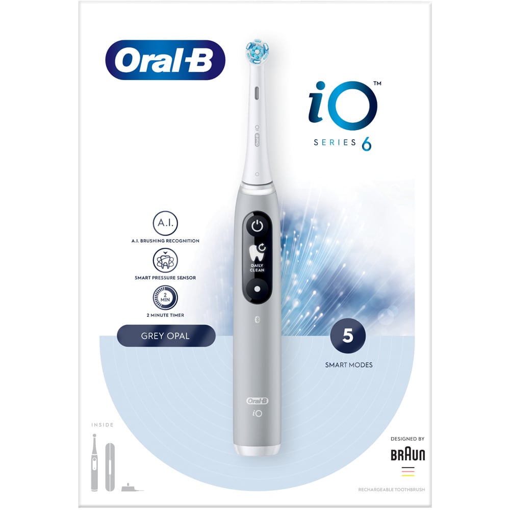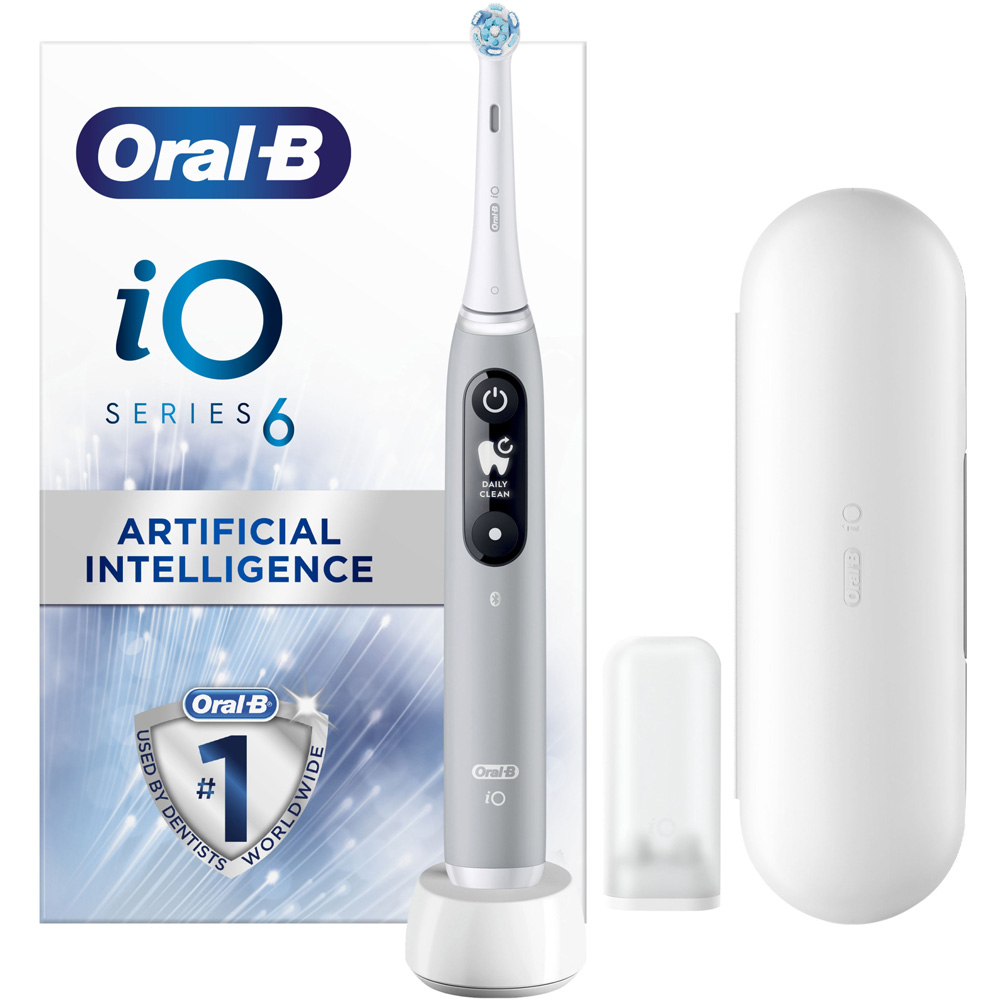 Get this Oral-B iO Series 6 Rechargeable Toothbrush with revolutionary technology for a professional purifying clean feeling and gentle brushing experience. It combines the unique round brush head from Oral-B with gentle micro-vibrations for a fresh, clean mouthfeel and 100% healthier gums in one week. The interactive display signals vital information including brushing modes and head replacement reminders, greets you as you power up and gives you a smile for a job well done. The artificial intelligence recognizes your brushing style and guides you to cover all your teeth, so you never miss a spot. It also features five smart modes including daily clean, sensitive, gum care, intense clean, and whitening to personalise your brushing. The enhanced smart pressure sensor signals red, white or green to alert you whether you’re brushing too hard, too softly or with just the right amount of pressure. The stylish grey electric-coloured handle comes with an ultimate clean brush head, a travel case and a charger.