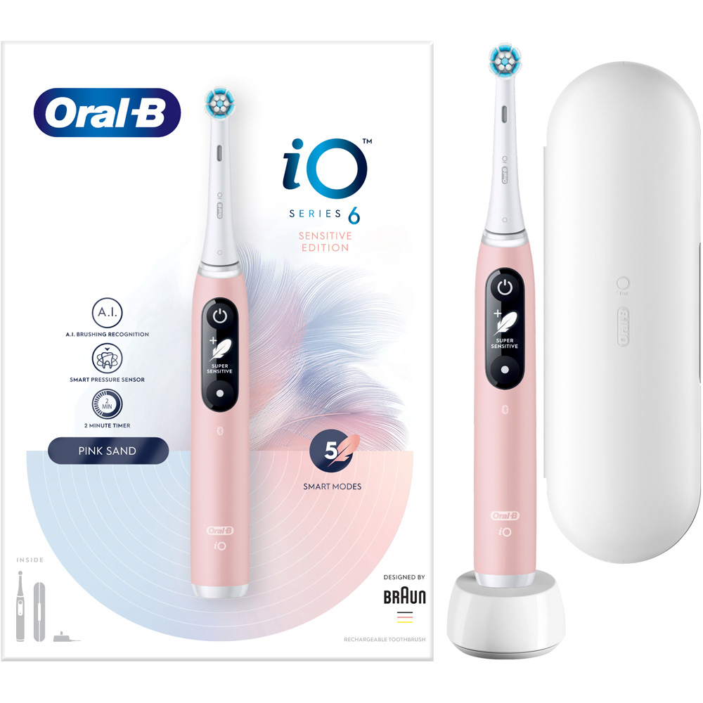 Get this Oral-B iO Series 6 Rechargeable Toothbrush with revolutionary technology for a professional purifying clean feeling and gentle brushing experience. It combines the unique round brush head from Oral-B with gentle micro-vibrations for a fresh, clean mouthfeel and 100% healthier gums in one week. The interactive display signals vital information including brushing modes and head replacement reminders, greets you as you power up and gives you a smile for a job well done. The artificial intelligence recognizes your brushing style and guides you to cover all your teeth, so you never miss a spot. It also features five smart modes including daily clean, sensitive, gum care, intense clean, and whitening to personalise your brushing. The enhanced smart pressure sensor signals red, white or green to alert you whether you’re brushing too hard, too softly or with just the right amount of pressure. The stylish pink-coloured handle comes with an ultimate clean brush head, a travel case and a charger.