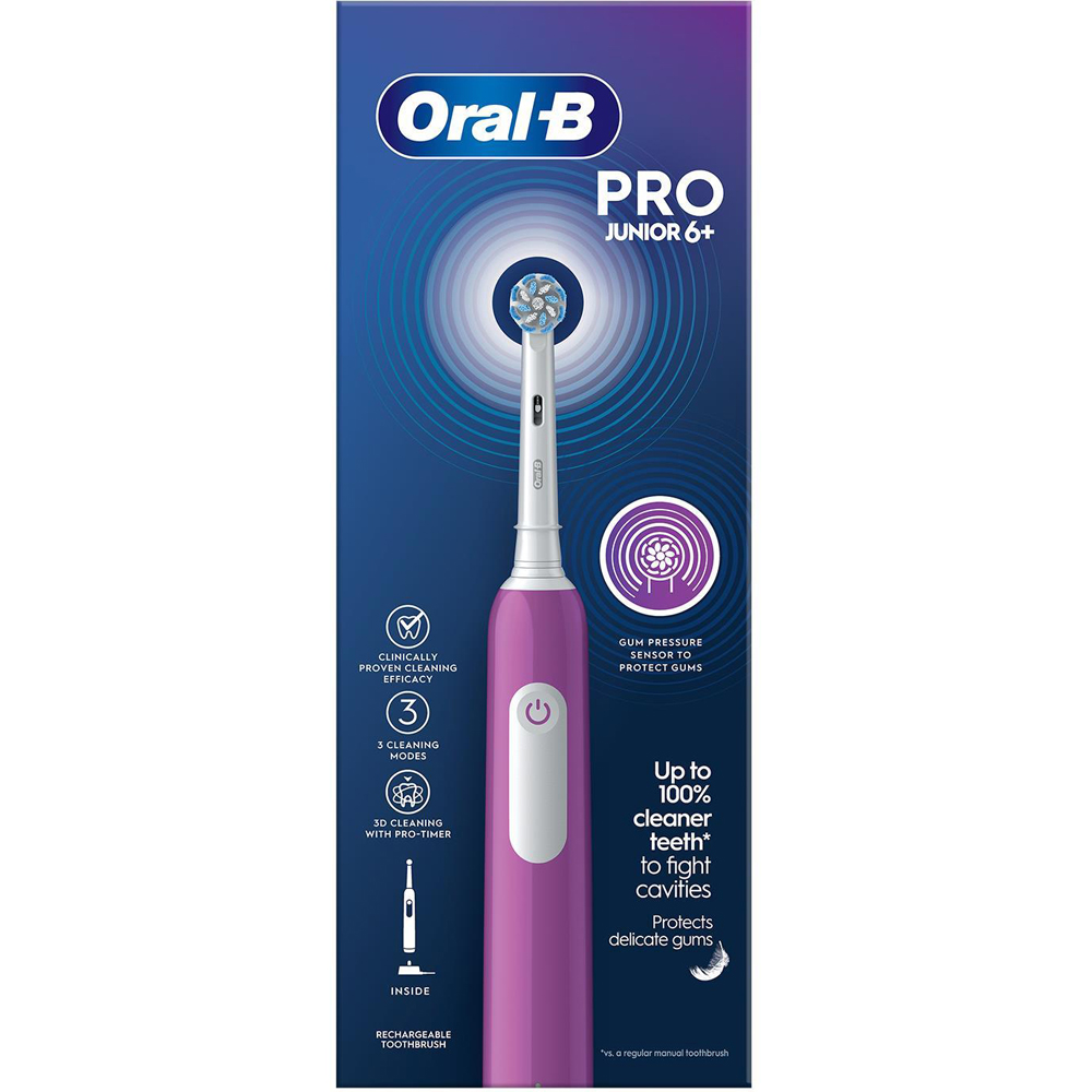 Oral-B Pro Junior Electric Rechargeable Toothbrush for Kids Aged 6+, Purple Getting children to brush can be a chore. Oral-B Junior 6+ electric rechargeable toothbrushes come in fun colours that can help to motivate your children to brush and give them a lifetime of healthy habits. This rechargeable electric kid's toothbrush features extra-soft bristles that are clinically proven to be gentle on children's teeth and gums, whilst removing more plaque than a manual toothbrush. The built-in brushing timer teaches children to brush the dentist-recommended 2 minutes, alerting them every 30 seconds to change to a different area of their mouth. Features: 3 brushing modes: daily clean, sensitive and polish Professional clean feeling every day and gentle brushing with the gum pressure control Extra thin soft bristle tips for a gentle yet effective clean Pause every 30 seconds to alert your child to change the area that's being brushed Electric toothbrush suitable for ages 6+ Long-lasting battery with charge indicator signalling when it's time to charge Oral-B 3D White Power Toothbrush Refill Heads As one of Oral-B's premium replacement toothbrush heads, the 3D White features an exclusive polishing cup that whitens teeth starting from day 1 by removing surface stains. Oral-B's improved 3D White toothbrush heads are developed with CleanMaximiser technology that turns green bristles yellow for optimal brush head performance and the best clean. The unique bristles brush away plaque for a more advanced clean than with a regular manual toothbrush. Compatible with all Oral-B handles except Pulsonic & iO. Features: With CleanMaximiser technology, green bristles turn yellow when it is time to replace your brush head Up to 100 Percent more plaque removal and healthier gums vs. a regular manual toothbrush Oral-B's best for whole mouth cleaning (excluding Oral-B iO) Perfectly angled at 16 degrees to reach deep between teeth and sweep away plaque Dentists recommend changing the brush head every 3 months for the best clean Safety Warning: Not for children under 3 years of age. Adult supervision is required. Note: Is not compatible with Pulsonic & iO.