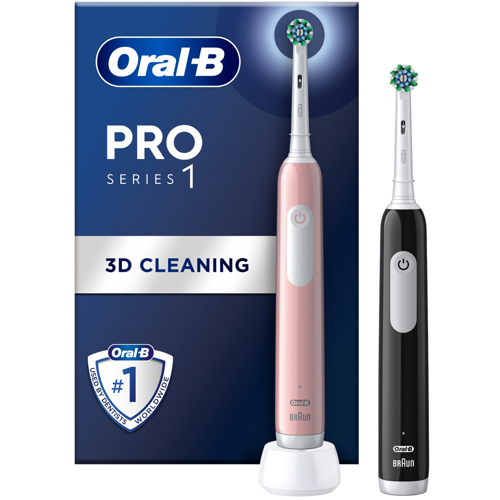 Experience the best oral hygiene with Oral-B Pro Series 1 Black and Pink Duo Electric Toothbrushes. from the no. 1 brand used by dentists worldwide. This electric toothbrush helps you brush like your dentist recommends for 2 minutes with the professional timer and it notifies you every 30 seconds to change the area you are brushing. While you are just moving the brush around your mouth, Oral-B's unique round head does all the rest. It removes up to 100% more plaque than a standard manual toothbrush for healthier gums, and it starts making your smile whiter than on the first day of brushing by removing surface stains. With the professional timer, Oral-B Pro Series 1 is a great toothbrush for everyone who wants to switch to an electric toothbrush. It features 3 easy-to-use to use clean modes. It consists of a handle-integrated quadrant timer that alerts you every 30 seconds to change your brushing zone.