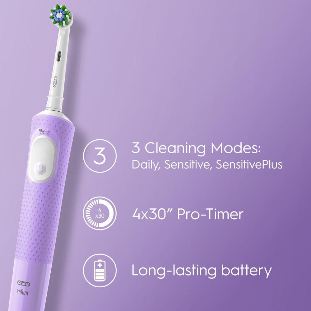 Oral-B Vitality Pro Electric Rechargeable Toothbrush w/ 2 Brush Heads Lilac, 2pk The Oral-B Vitality Pro electric rechargeable toothbrush provides a clinically proven superior clean vs. a regular manual toothbrush. The toothbrush comes with 3 brushing modes: daily clean, sensitive and sensitive plus mode for an amazingly gentle experience. An in-handle timer helps you brush for a dentist-recommended 2 minutes. Best of all its brought to you by Oral-B the #1 brand used by dentists worldwide. Unique Oral-B's 2D Cleaning Technology: oscillates and rotates for up to 100% more plaque removal vs. a manual brush. 3 Brushing Modes: Daily Clean, Sensitive and unique Sensitive Plus mode for an amazingly gentle experience. Cleaning Efficacy: Oral-B's brush head fades from green to yellow to indicate when it's time to change, to keep a 100% cleaning efficacy. Brush Technology: 2 heads included round. Brush head replacement warning. 3 cleaning modes including daily clean, sensitive, sensitive+ 2-minute timer. Recharge indicator light Rechargeable Safety Warning: Periodically check the entire product/cords/accessories for damage. A damaged or non-functioning unit should no longer be used. If the product/ cords/accessories are damaged, take it to an oral-b service centre. Do not modify or repair the product. This may cause fire, electric shock, or injury. Usage by children under age 3 is not recommended. Toothbrushes can be used by children and persons with reduced physical, sensory or mental capabilities or lack of experience and knowledge, if they have been given supervision or instruction concerning the use of the appliance in a safe way and understand the hazards involved. Cleaning and maintenance shall not be performed by children. Children shall not play with the appliance. Use this product only for its intended use as described in the instruction manual. Do not use attachments that are not recommended by the manufacturer. Each Box Contains: 1x Oral-B Vitality Pro Electric Rechargeable toothbrush handle, 1x Charger, 2x Brush heads.