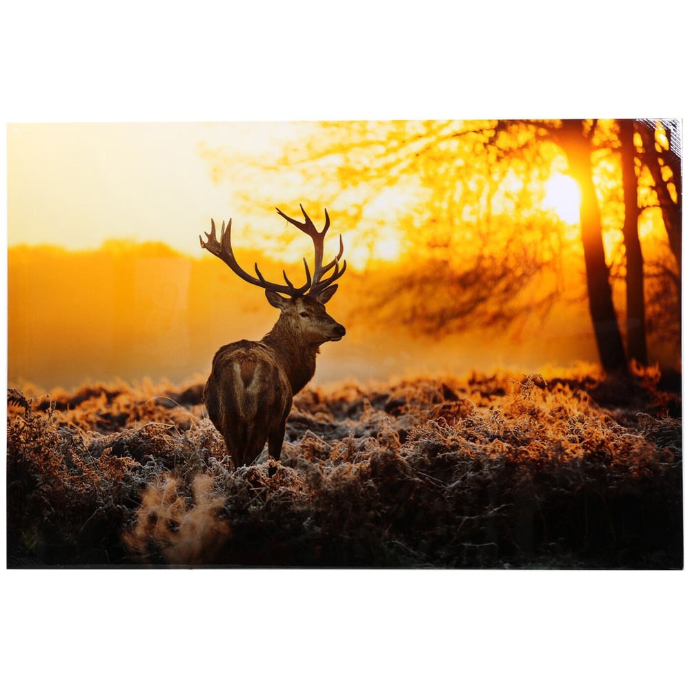 The Forest Deer at Sunset Framed Print is a peaceful and tranquil bit of art that adds a pop of colour to your space. The print depicts a stag standing in a forest clearing, lit by the bright orange sunset, adding a warm and rich tone to your room. This art is quick and easy to hang with the included fixings, making it ideal for any home.