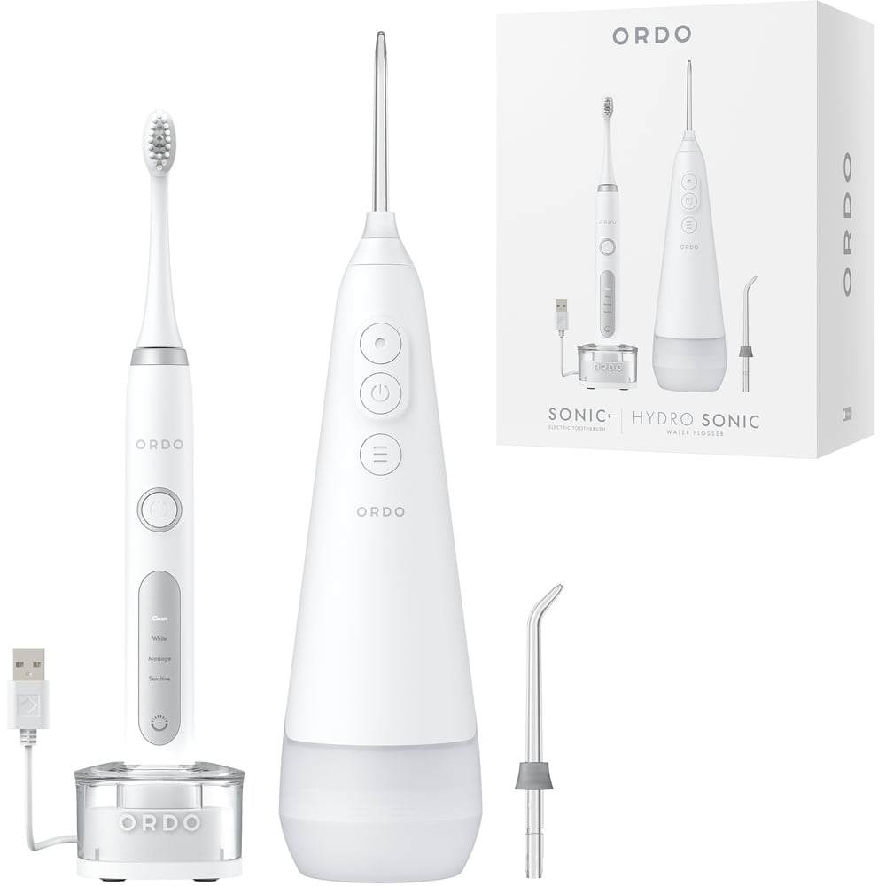The Ordo Hydro Sonic Water Flosser is designed and approved by dentists to ensure you can achieve the deepest most effective clean at home or on the move. The Hydro Sonic Water Flosser uses the power of hydro-kinetic technology to blast away plaque and food debris from between teeth and along the gum line. Get better protection against cavities and gum disease, and keep your breath fresher, all while being gentle on your gums. Water flossing is also easier and more effective than manual flossing for cleaning around braces, bridges and implants. With up to 2000 water pulsations per minute, three pressure settings, an 'on demand' mode and 360 degree nozzle rotation, it ensures effective plaque removal and promotes healthier, whiter teeth. The Ordo Sonic+ Toothbrush, designed and approved by dentists, is a high-quality and stylishly designed electric toothbrush that offers a deeper, bespoke cleaning experience. With 40,000 sonic pulses per minute and four bespoke brushing modes, it ensures effective plaque removal and promotes healthier, whiter teeth. Plus, it comes with a 60-day money-back guarantee. Two-year warranty. Three pressure settings. Four+ weeks battery. 260ml tank capacity. Travel lock. 80 to 160 PSI. Portable. Rechargeable. Patented travel feature. Ergonomic design. USB-C Charging. Waterproof design - IPX7. 40,000 sonic pulses. Four brushing modes. Smart two-minute timer. Quad pacer. High-quality bristles. Travel cap included. Waterproof design. Suitable for dental work.