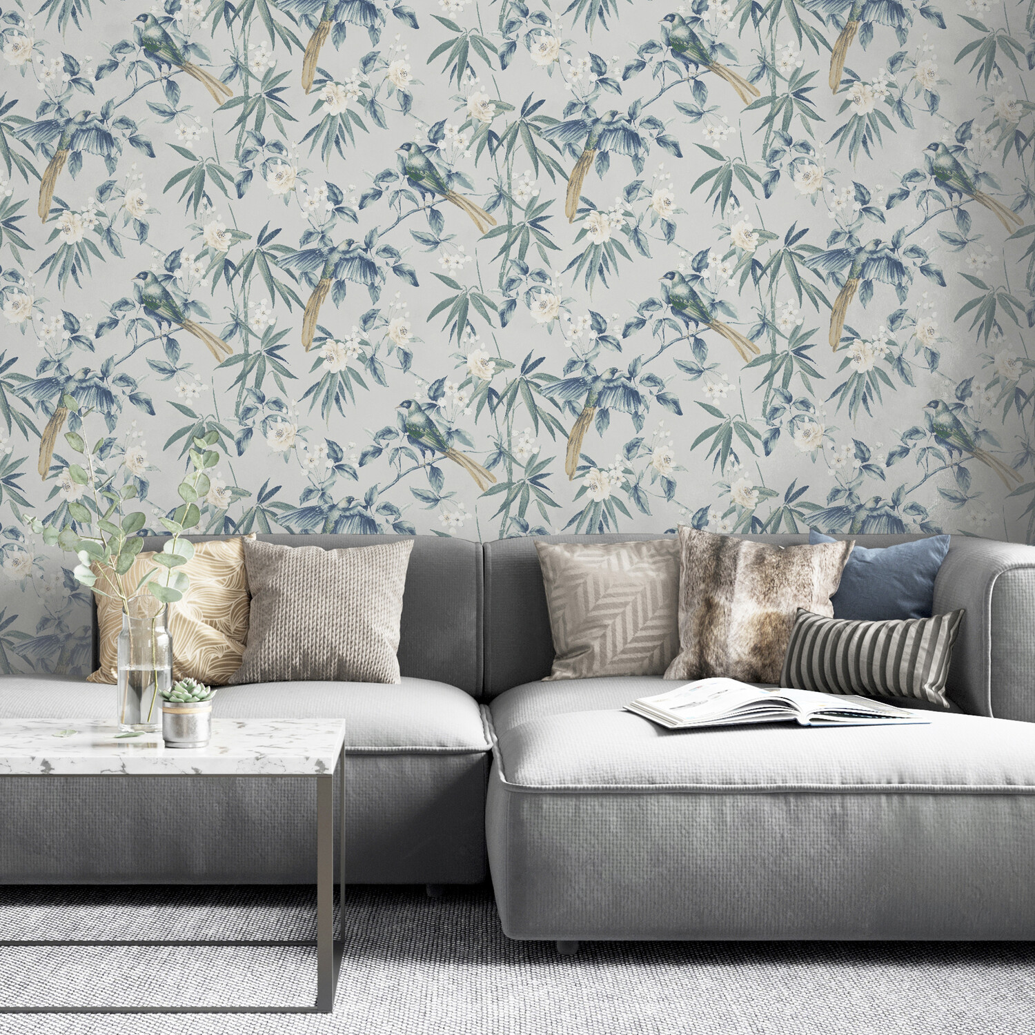 This stunning Oriental Floral Birds Wallpaper combines delicate blossom flowers, bamboo-like plants, and beautiful birds in a harmonious design. Bringing a touch of serenity and elegance, it's a wonderful choice for a feature wall or all four walls. The modern blue and grey colourway adds a sophisticated and natural look to any room. Roll Length: 10.05m