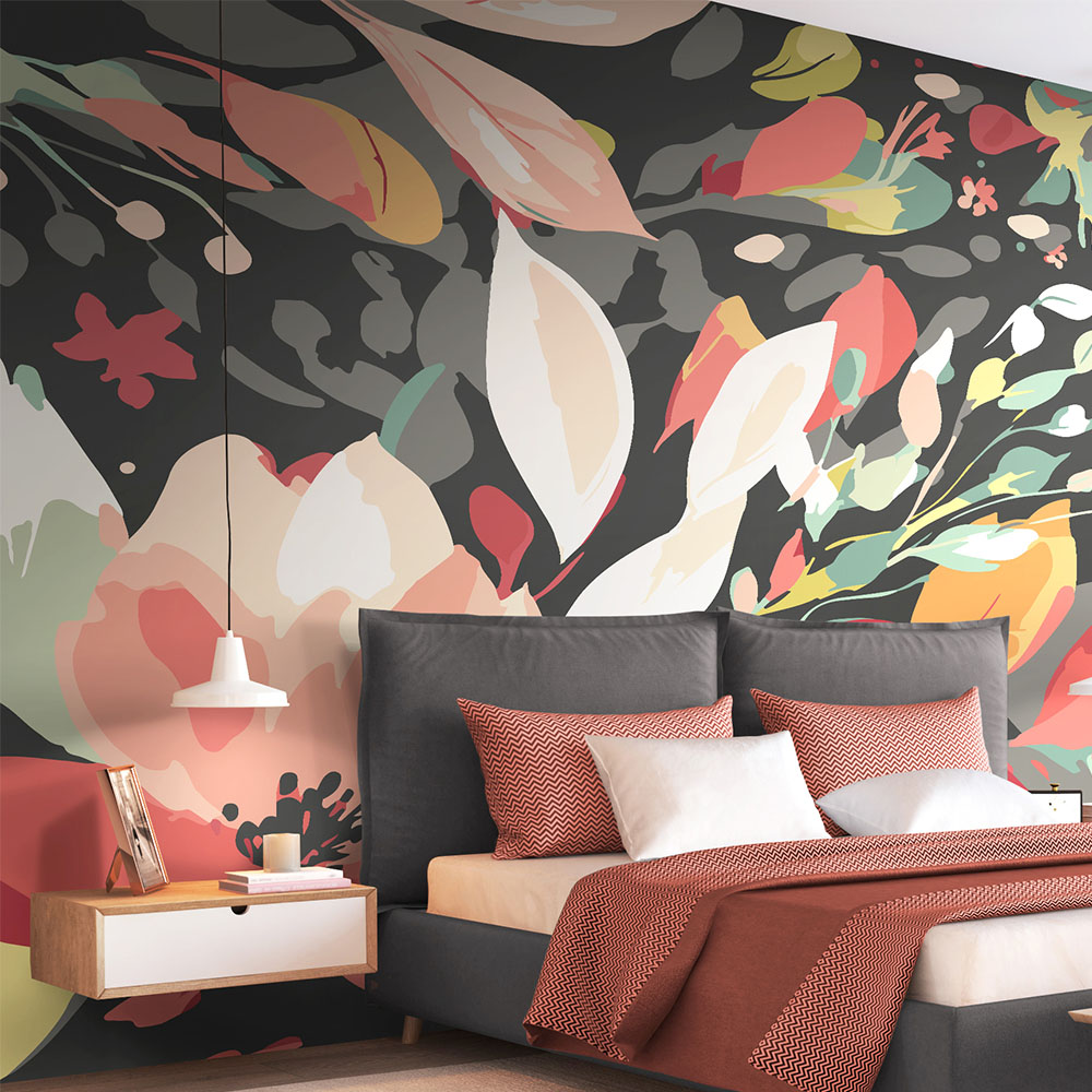 Transform the look and vibe of your space with Origin Murals Flowing Flowers Black Wall Mural. Painterly petals and leaves are scattered across this beautiful bold design, and shadows create dimension and add a sense of movement.