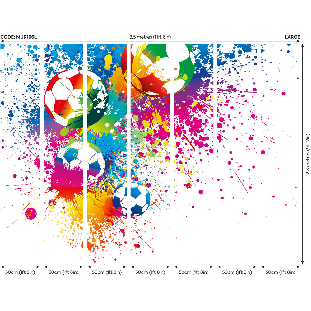 Give your space a sporty look with this Origin Murals Football Splash Multicolour Wall Mural. It flaunts a bold and vibrant design you'll love. This mural features a football design that's bursting with colour and dynamicity and makes a loud and playful statement to elevate your living space decor with ease. It also offers an easy, paste-on-the-wall application for your convenience and comes with cut guidelines and hanging instructions for added ease. Size: 3.5 x 2.8m.