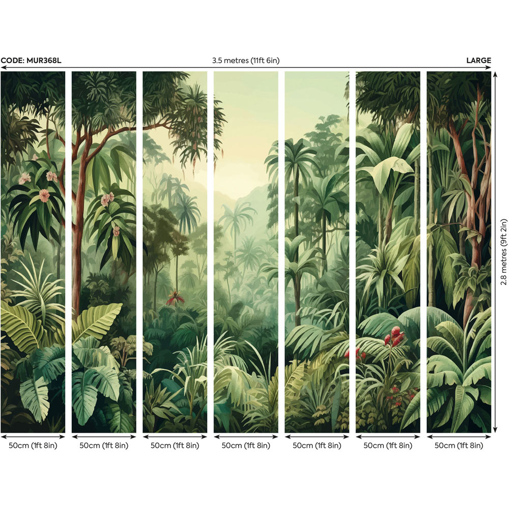Transform the look and vibe of your space with Origin Murals Jungle Trees Green Wall Mural. This wallpaper depicts a jungle scene of dense foliage and palm trees, with more faded, distant palm trees and mountains featured in the background, which truly allows a sense of depth and dimension.