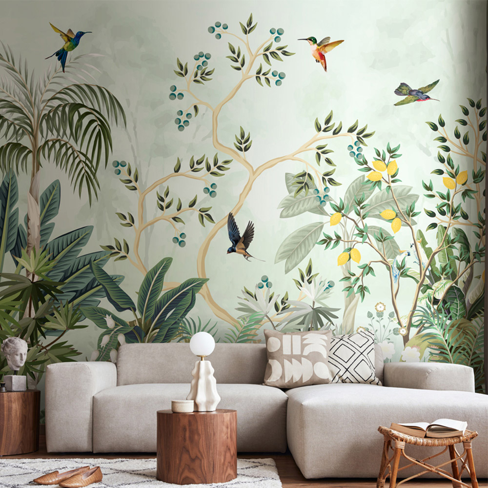 Elevate your living space ambience with this Origin Murals Lemon Tree Forest Green Wall Mural. It's designed with intricately painted leaves, petals and birds to add a touch of charm to it. While the lemons dotted amongst branches and vines throw little splashes of vibrancy and life on it. The wallpaper offers an easy, paste-on-the-wall application for your convenience. It also comes with cut guidelines and hanging instructions for added ease. Size: 3 x 2.4m.
