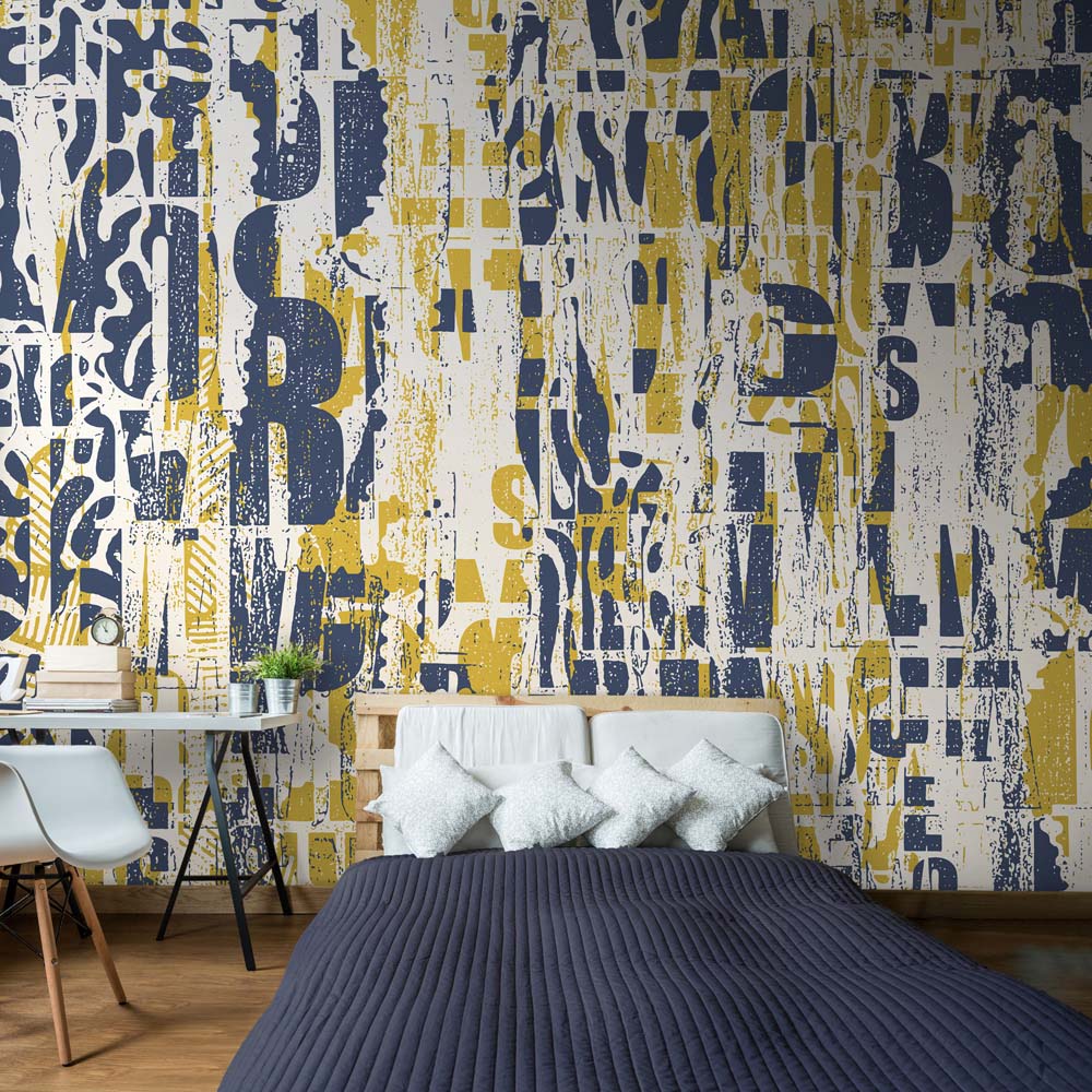 Redesign and elevate your space with Origin Murals Letterpress Graffiti Multi Wall Mural. This design features bold, printed letters of different sizes, overlapping each other and sitting against coloured ground. Grungy and worn this mural has a raw urban feel to it.