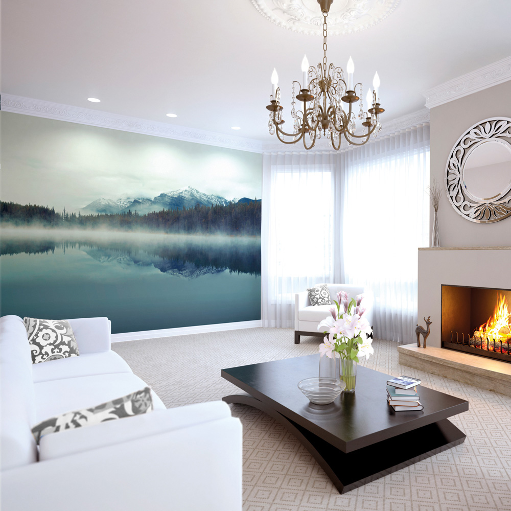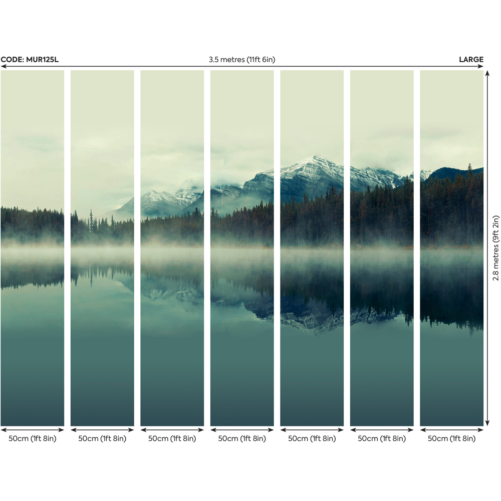 Enhance your living space ambience with this Origin Murals Misty Mountain Lake Blue Wall Mural. It's designed with snow-capped mountains and thick evergreen forests that are mirrored on a still and clear lake. With a layer of light mist above the water that adds drama and atmosphere, this serene scene mural can effortlessly elevate your space. It also offers an easy, paste-on-the-wall application for your convenience. It comes with cut guidelines and hanging instructions for added ease. Size: 3.5m x 2.8m.