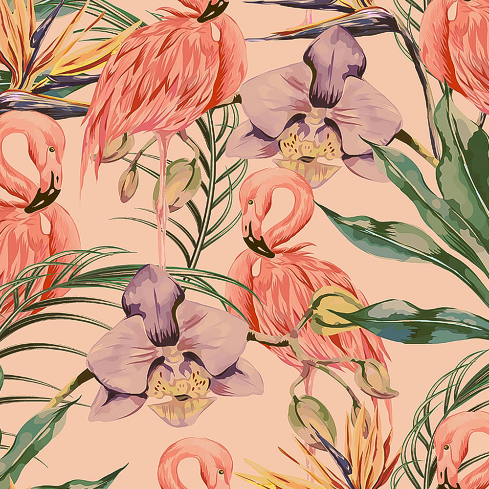 Large-scale and abundant, wildlife in all its forms come together in this tropical scene. Painterly palm leaves host fluffily-feathered flamingos and soft watercolour orchids, whilst bird of paradise flowers reach skyward in the background creating height and textured layering.