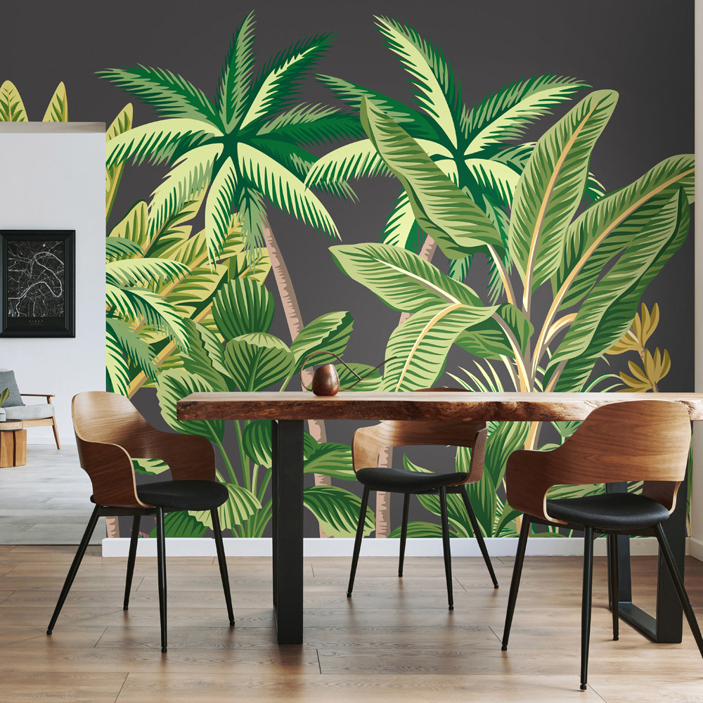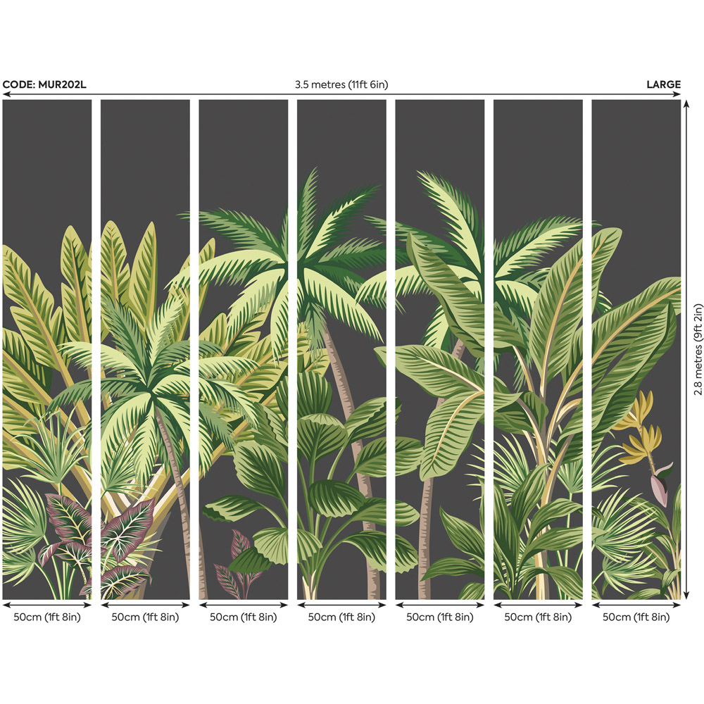 Upgrade your living space decor with this Origin Murals Tropical Palm Trees Black Wall Mural. A stylish tropical mural, it's designed with multiple swaying palm trees, exotic foliage and banana leaves to give it a lively touch. It flaunts a vibrant, bold design that is full of personality so you can elevate your living space decor effortlessly. This mural also offers an easy, paste-on-the-wall application for your convenience and comes with cut guidelines and hanging instructions for added ease. Size: 3.5 x 2.8m.