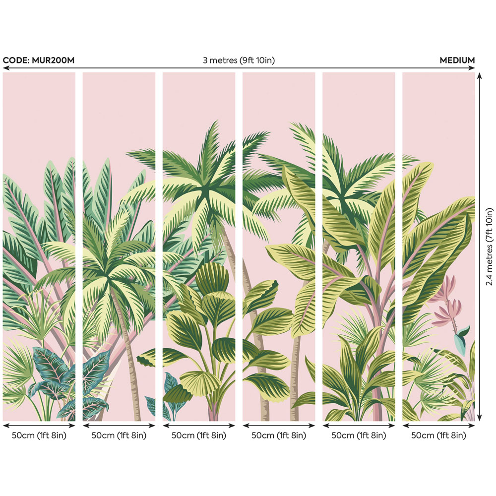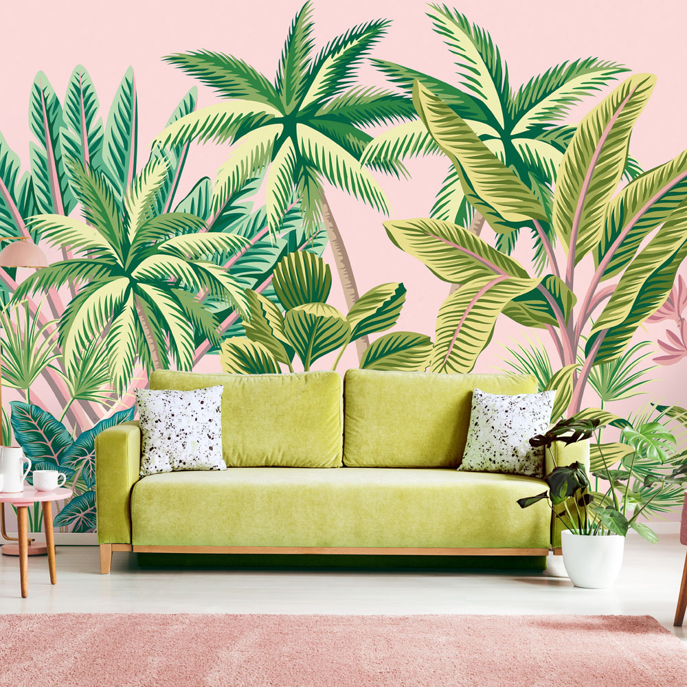 Add instant charm to your space with this Origin Murals Tropical Palm Trees Pink Wall Mural. This tropical mural features abundant swaying palm trees, exotic foliage and banana leaves. It has a vibrant and bold design that can go with any interior. This mural has a complete design on one roll. It comes with cut guidelines and hanging instructions included. Application: paste the wall.