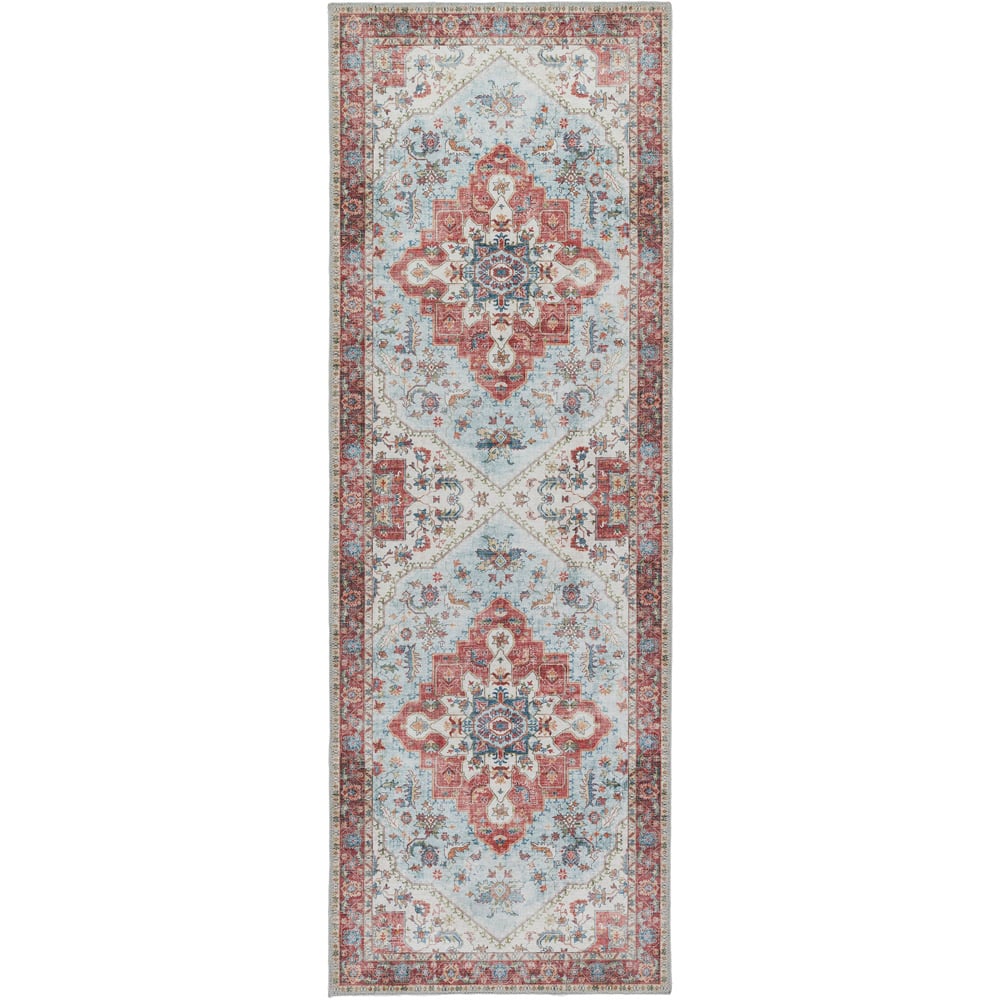 Style your home beautifully with this Origins My Washable Blue and Red Marrakesh Rug 67 x 200cm. These easy-care rugs are an excellent solution for busy households where spills are bound to occur. It features a traditional Marrakesh design and colours. It also has rich colours of deep reds with soft blues and offers a traditional style with a modern twist. This design also features a large medallion, an elaborate border, and a distressed look. It is made from soft yet hard-wearing chenille and TRP with a non-slip backing. It is ideal for high-traffic areas such as your kitchen, hallway, dining room and living rooms. Care and use–It is machine washable at 30°C and does not use bleach. It is recommended to use line drying. If using a dryer, do not use heat. Use an air-only dry cycle.