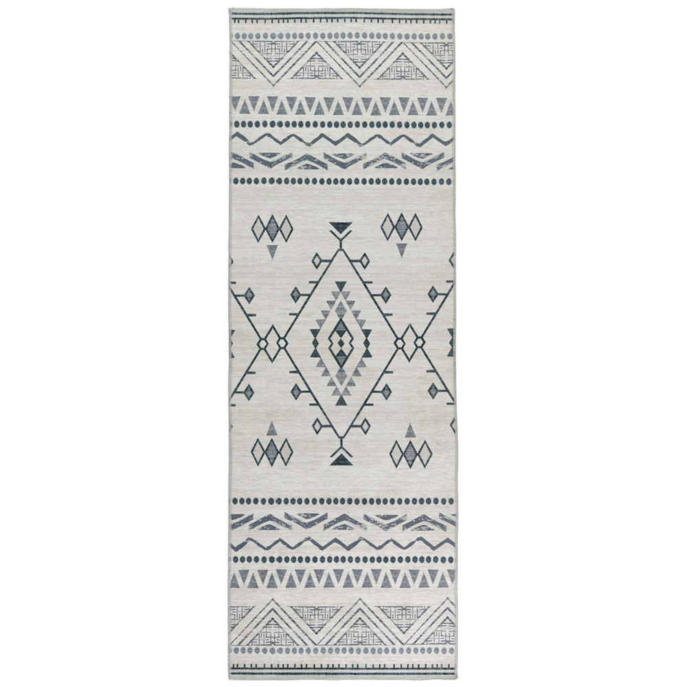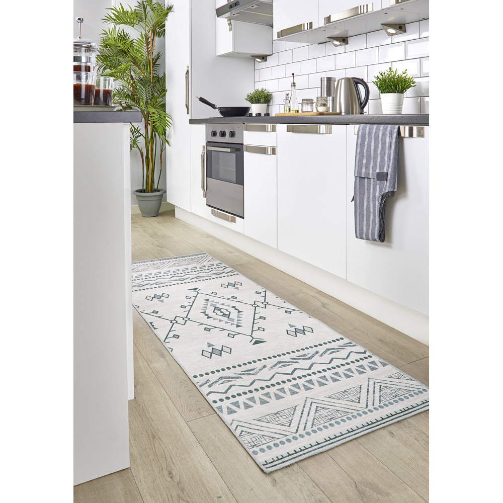 Style your home beautifully with this Origins My Washable Grey and Off-White Nomad Rug 67 x 200cm. These easy-care rugs are an excellent solution for busy households where spills are bound to occur. It features a combination of geometric textured shapes in a classic Aztec design in shades of beautifully soft grey and an off-white background. It is made from soft yet hard-wearing chenille and TRP with a non-slip backing. It is ideal for high-traffic areas such as your kitchen, hallway, dining room and living rooms. Care and use–It is machine washable at 30°C and does not use bleach. It is recommended to use line drying. If using a dryer, do not use heat. Use an air-only dry cycle.