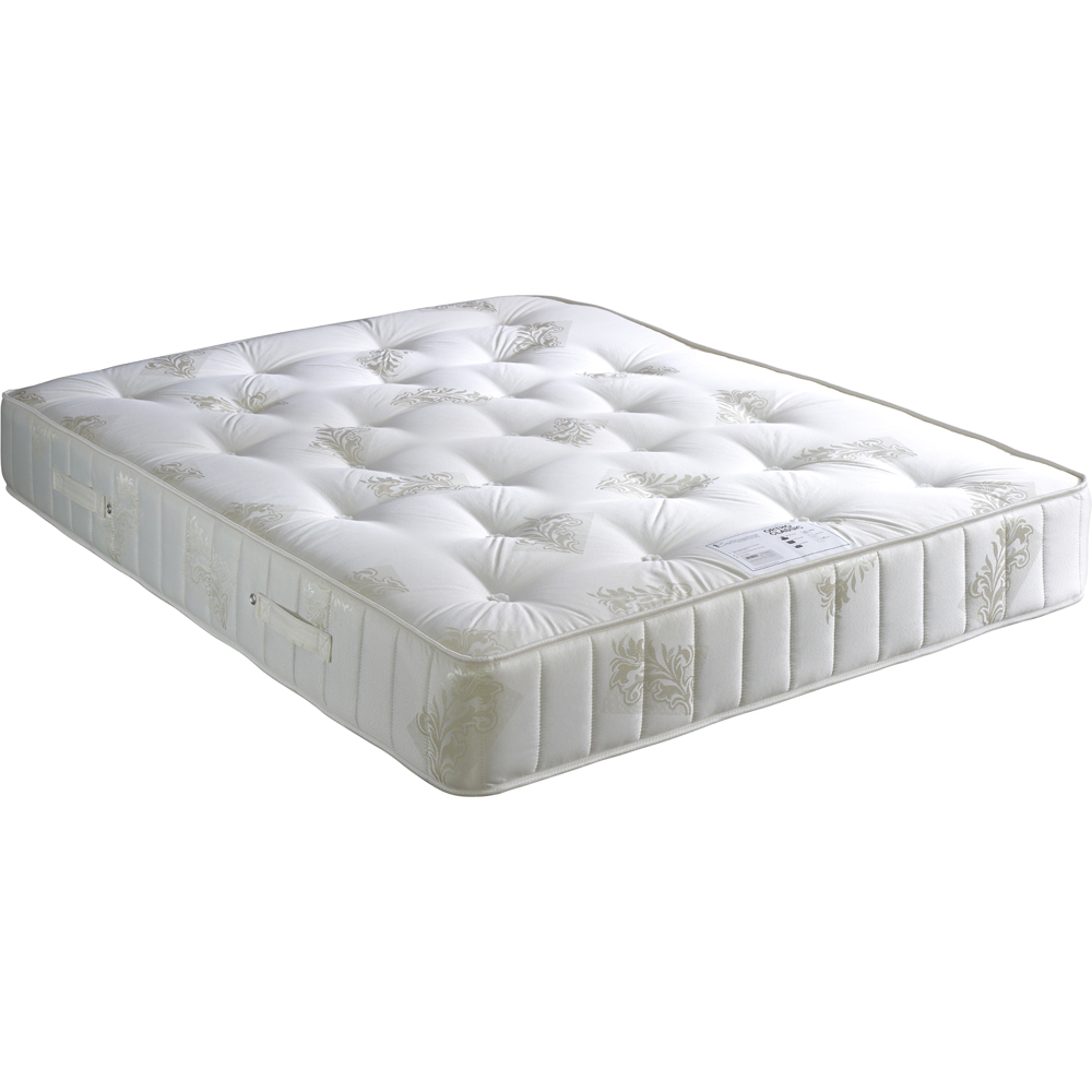 The Bedmaster Ortho Classic King Size Orthopaedic Mattress is specifically designed to provide exceptional support to your spine, ensuring a comfortable and restful sleep. It features a Bonnell spring unit with an open coil construction, which adds to its overall comfort. Additionally, the mattress is made with traditional layers of fillings for added cushioning. The damask cover is beautifully upholstered and has an eye-catching design. The hand-tufted finish ensures that all the fillings stay in place, making the mattress both comfortable and durable. The mattress also includes separate springs that are arranged in lines and interlinked with helical wire, as well as a rod that supports the edge of the mattress. It is designed with handles for easy turning and rotating, and air vents to keep you feeling fresh while you sleep. It has a depth of 25cm and is made with orthopaedic features, ensuring proper support for your body.
