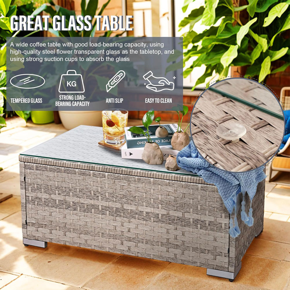 PE Rattan, Steel, Glass, Cushions