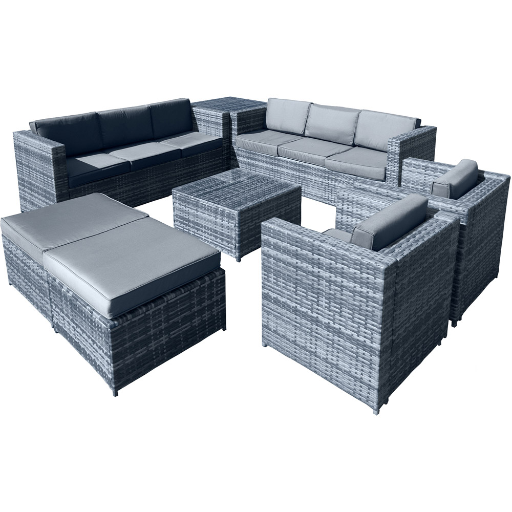 Experience the ultimate in outdoor luxury with the Oseasons Malta 10 Seater Ocean Grey Rattan U-Shape Sofa Set with 2 Footstools. This impressive set is crafted from weatherproof, premium UV-stabilised PE rattan, ensuring it can be left outdoors all year round. Designed to seat up to 10 people, the Malta U-Shape Set includes two single armchairs, two three-seat sofas, a square coffee table, a tall side table, and two oversized footstools. With a total weight of 90.5kg, some assembly is required.