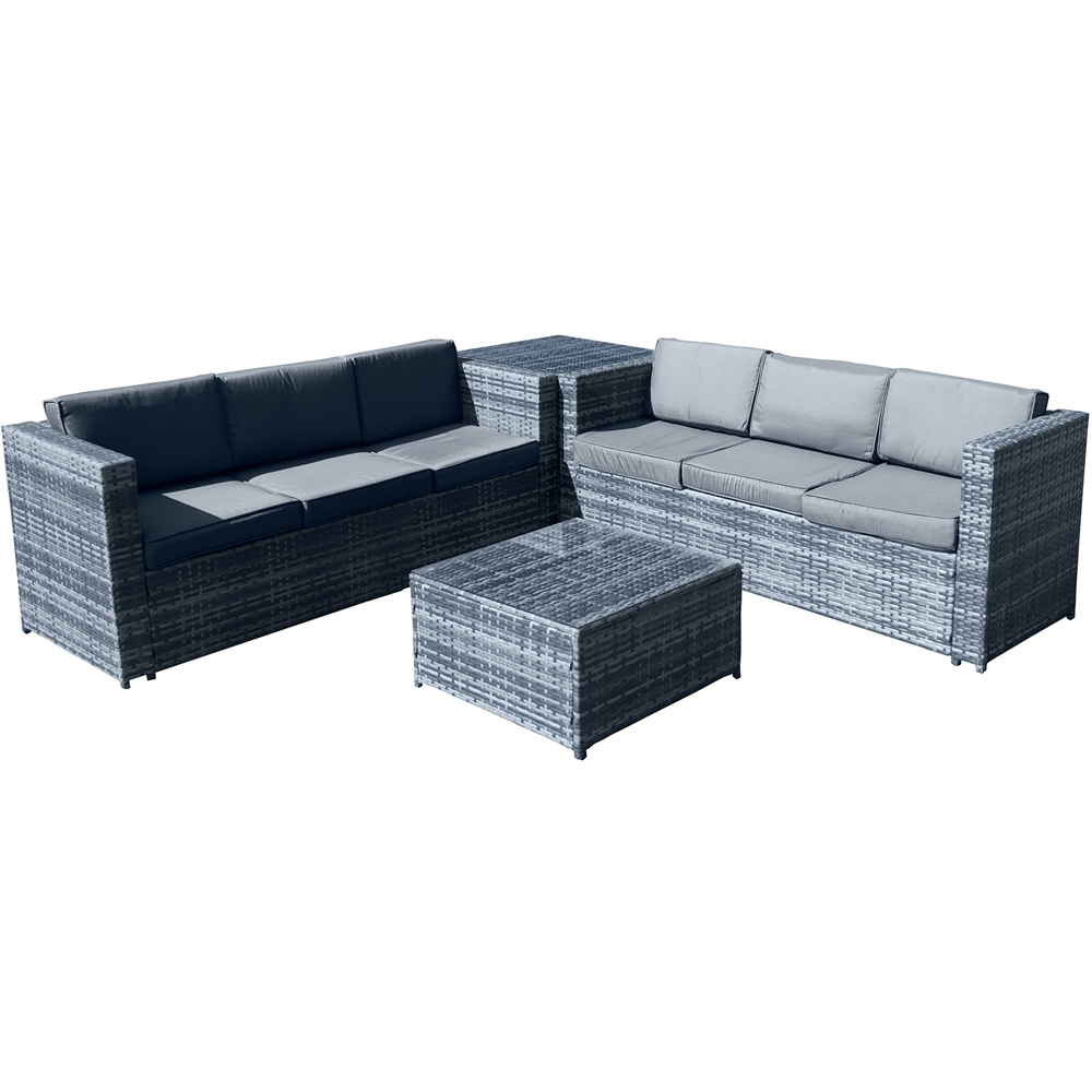 Elevate your outdoor living with the Oseasons Malta 6-Seater Ocean Grey Rattan Corner Sofa Set. Designed for relaxation, this set is perfect for lazy afternoons, providing a comfortable and inviting experience. The set includes two three-seat sofas, a square coffee table, and a tall side table, all crafted from weatherproof, premium UV-stabilized PE rattan. The modular set allows for mix-and-match flexibility, supported by high-quality metal frames for durability. With a total weight of 60.5kg, some assembly is required.