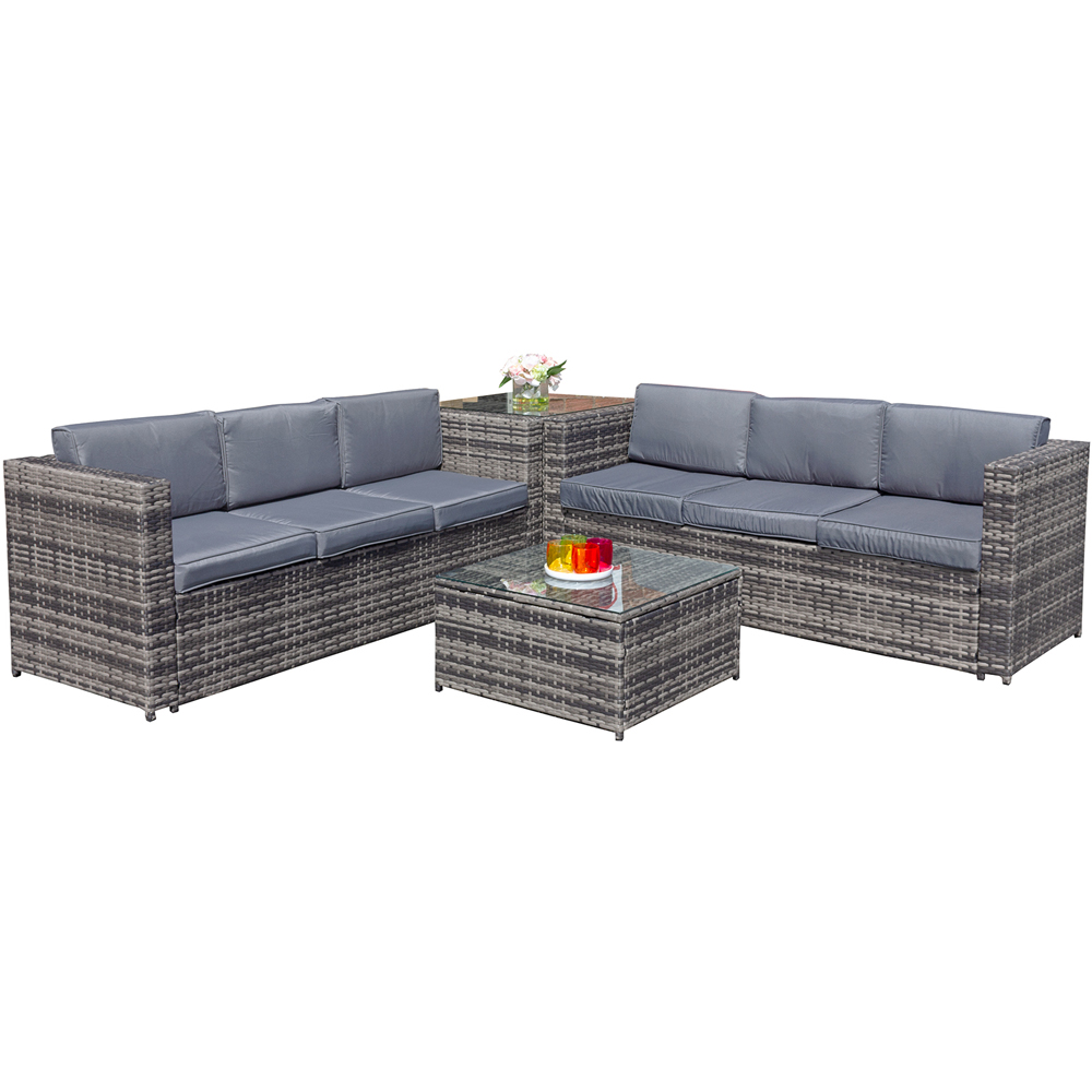 Elevate your outdoor living with the Oseasons Malta 6-Seater Walnut Grey Rattan Corner Sofa Set. The Malta Deep Seating Collection offers an affordable way to infuse luxury into your garden or conservatory. Designed for relaxation, this set is perfect for lazy afternoons, providing a comfortable and inviting experience. The set includes two three-seat sofas, a square coffee table, and a tall side table, all crafted from weatherproof, premium UV-stabilised PE rattan. The modular set allows for mix-and-match flexibility, supported by high-quality metal frames for durability. With a total weight of 60.5kg, some assembly is required.