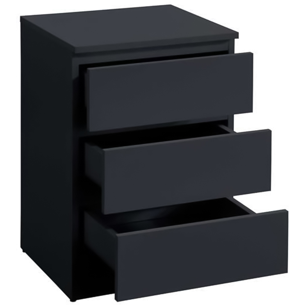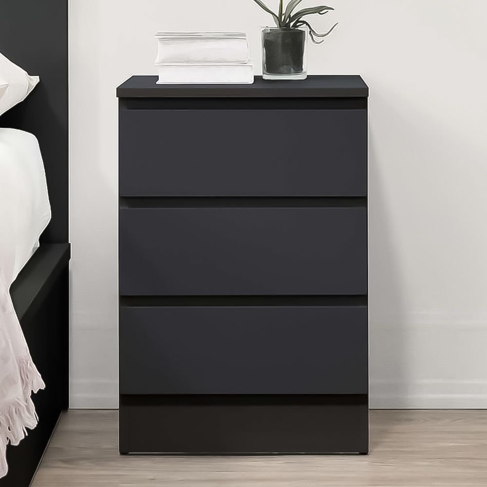 Elevate your bedroom decor with the Oslo Bedside Table. This black bedside table has a splendid design with a sturdy structure. It features a smooth top for keeping your alarm clock or display items with sleek grooved handles and a sturdy base. It also features a three-drawer design with ample storage space for your essentials. This bedside table crafted using durable material is ideal for all types of contemporary and traditional interior spaces.