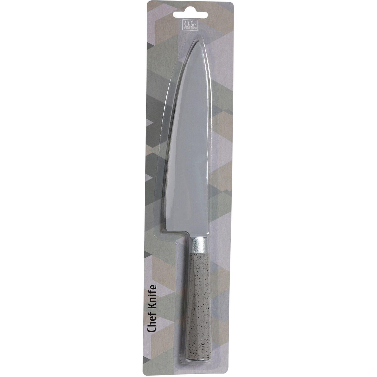 Whether you're a seasonal cook or a professional chef, this Oslo Chef Knife is a must-have kitchen tool for you! This versatile knife has a long blade with a pointy tip and curved body, which can be utilised for numerous cutting tasks. Plus, it's made from durable stainless steel and has a grey non-stick finish to prevent products from sticking. Designed in grey with a flecked finish, the knife has a soft-touch plastic handle, making it safe and easy to use. You can match this chef knife with other utensils from the Oslo collection to complete the set.