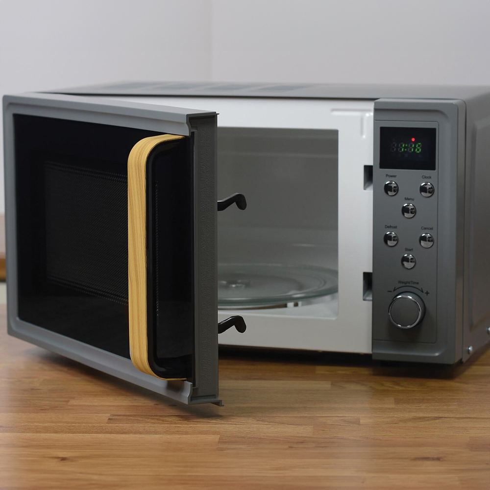 Make a stylish and practical addition to your kitchen top with this Oslo Grey Microwave. Featuring a Scandinavian design, this microwave features a wood-effect handle and easy-to-use controls for simple use in style. It has five power settings to suit whatever you're cooking and a defrost function for added convenience. Also, the microwave has a digital clock and a traditional end-of-cooking signal. With a large 20L capacity, a child lock, express and multi-stage cooking, this functional appliance is a must-have on your kitchen countertop. Power: 800W.