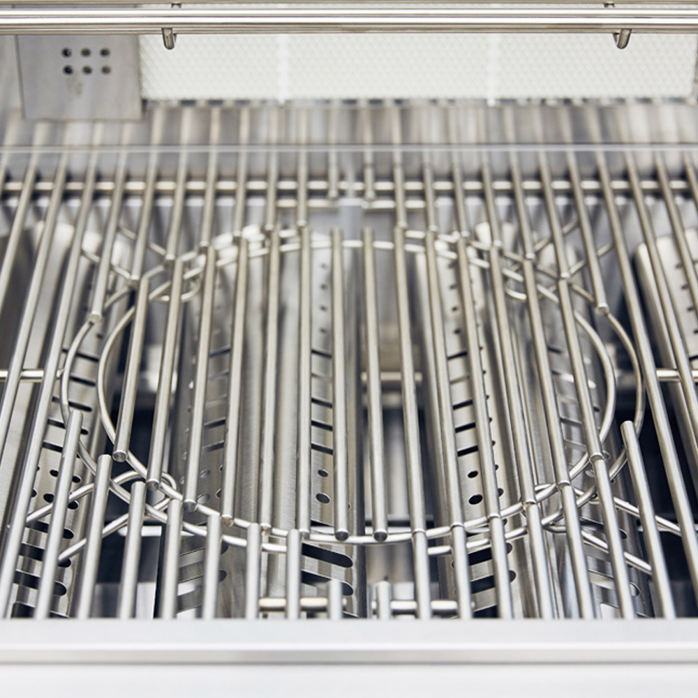 Fully stainless steel, pre-assembled 4 burner gas BBQ. Complete with back burner for use with rotisserie, brass side burner for additional cooking space. Three drawers and cabinet. The cooking grill can be removed and exchanged for Pizza Stone, cast iron griddle, cast iron paella dish, wok and steak grill.