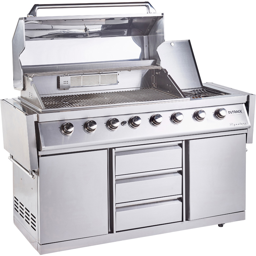 Fully stainless steel, pre-assembled 6 burner gas BBQ. Complete with back burner for use with rotisserie, brass side burner for additional cooking space. Three drawers and cabinet. The cooking grill can be removed and exchanged for Pizza Stone, cast iron griddle, cast iron paella dish, wok and steak grill.