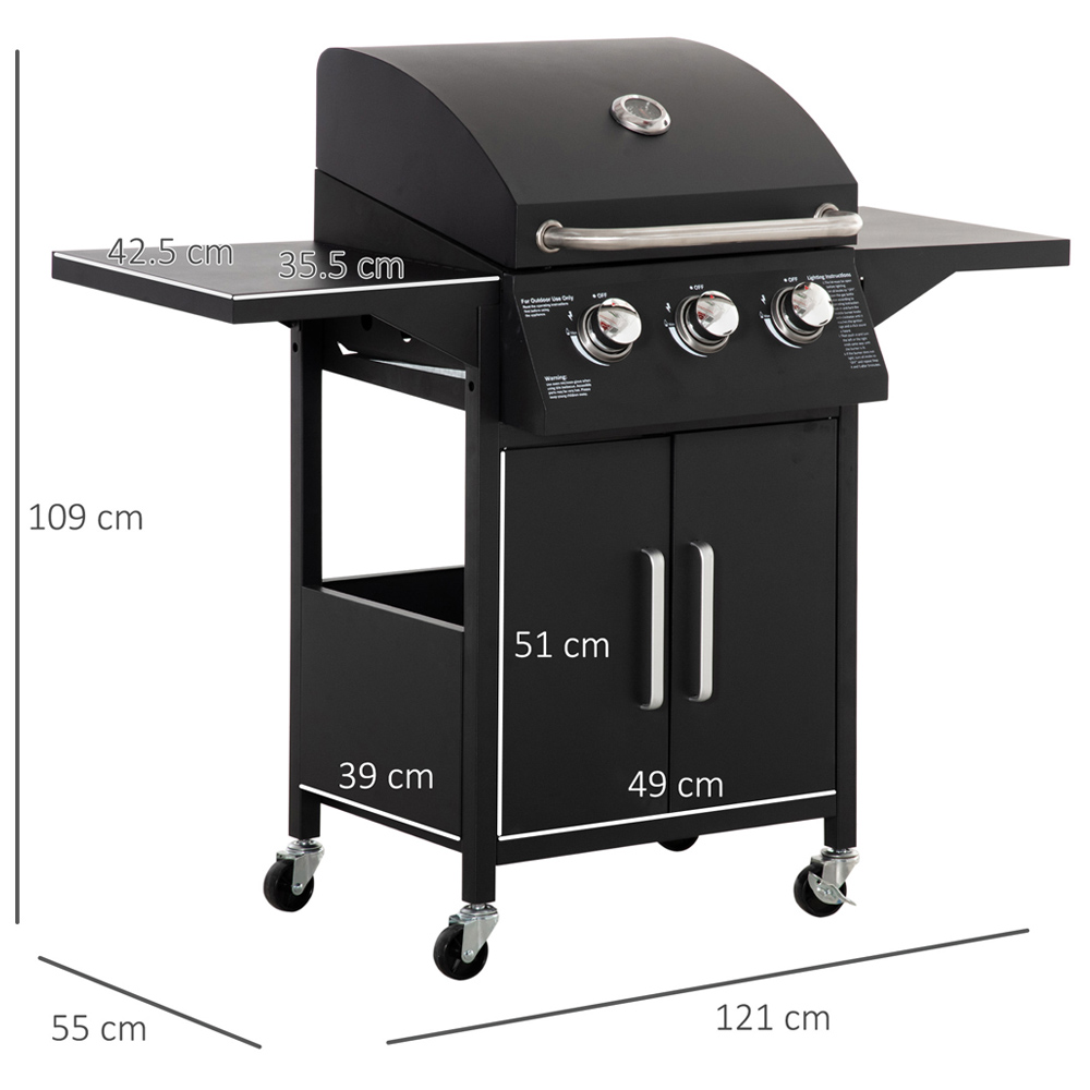 Host garden parties effortlessly with this Outsunny Black Outdoor 3-Burner Gas Grill BBQ Trolley. Made with a carbon-steel body, the BBQ is tough and reliable for long-term use. Featuring three burners, this device is perfect for creating individual cooking zones ideal for cooking a variety of food items. Also, it comes with a large grill, which is suitable for cooking meals quickly for many people. Easy to use, each burner can be turned on easily with the piezo ignition. Apart from this, the unit includes two side shelves, a top warming rack, and a bottom cabinet for additional convenience. The device comes complete with a lid finished with a thermometer to see the inner temperature and add a smoked effect to food. Size: 121 x 109 x 55cm. Keep your BBQ covered and protected with our range of premium BBQ covers.