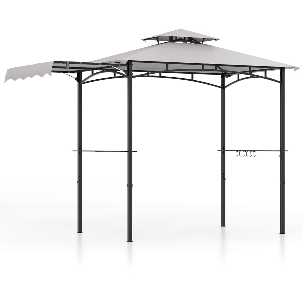 Must-have grill gazebo for enjoyable outdoor BBQs, picnics, parties! The 318 x 153 cm large grill gazebo is designed to cater to your outdoor dining needs while providing ample shading. You can fold and open the side awning with ease to adjust the canopy based on your preferences and the weather conditions. Additionally, the canopy tent boasts a sun-protective and flame-retardant polyester canopy, ensuring you are shielded from the sun's rays. The rustproof metal frame makes the soft top gazebo a stable investment for your outdoor space. Equipped with bar tables and 6 hooks, the grilling shelter provides ample storage space for all your grilling essentials. With a vented top and 8 ground stakes, the gazebo offers enhanced wind-resistance. More importantly, the thumb screws make installation a breeze, which is energy-saving. Extended Sunshade Space: The 318 x 153 cm double-tier gazebo comes with an additional awning, offering generous sunshade space. With upgraded hydraulic rods, the side awning can be folded with ease. Therefore, the large gazebo tent is perfect for outdoor BBQs, parties, gatherings. Double-tier Vented Canopy: Crafted from polyester fabric, the canopy of the grill gazebo is flame-retardant, drizzle-resistant and sun-protective, ensuring you are safe. Additionally, the double-tiered canopy top of the BBQ gazebo will promote air circulation, facilitate smoke evacuation and enhance overall stability. Ample Space and Considerate Details: Equipped with 2 side shelves, 6 hanging hooks, the grilling shelter offers ample storage space for your drinks, plates, and grilling accessories. With a built-in bottle opener, you can immediately enjoy the drinks. Plus, the top hook enables you to hang lamps for dark environment. Stable Heavy Duty Structure: The heavy-duty powder-coated metal frame of the soft top grill gazebo provides excellent stability and rust resistance, ensuring lasting longevity. Additionally, 8 ground stakes are provided to keeping the double tiered canopy tent firmly in place during windy conditions. Hassle-free Assembly: Equipped with thumb screws, the gazebo frame can be effortlessly connected without the need for additional tools, ensuring a hassle-free installation process. Furthermore, the 3-level extension rods allow you to fine-tune the canopy to your desired state of perfection.