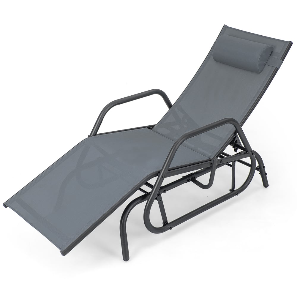 Experience the ultimate relaxation with this Costway Grey Outdoor Chaise Lounge Glider Chair with Armrests. It is designed to offer both reclining and gliding motions in one stylish piece. Choose your perfect comfort setting with the three-level adjustable backrest and tailor the pillow position to suit your height for an unmatched relaxation experience. Made with a sturdy metal frame, this lounge chair provides strong support and is equipped with a side handle for smooth, effortless gliding. Ideal for reading, sunbathing, or simply enjoying a peaceful moment outdoors, this chair combines functionality with comfort, making it a must-have for any outdoor space.
