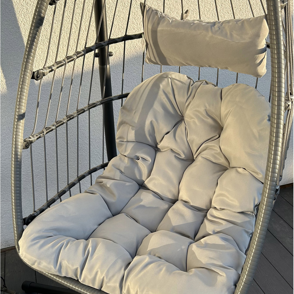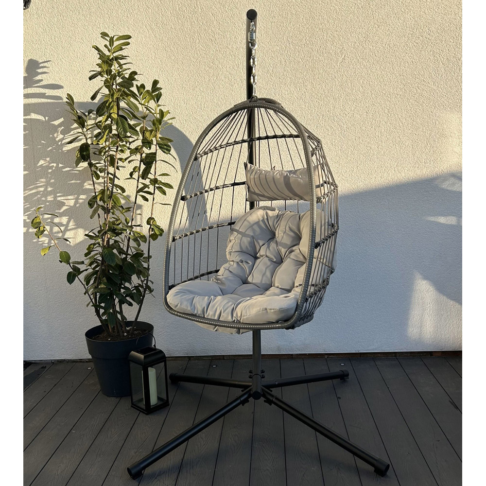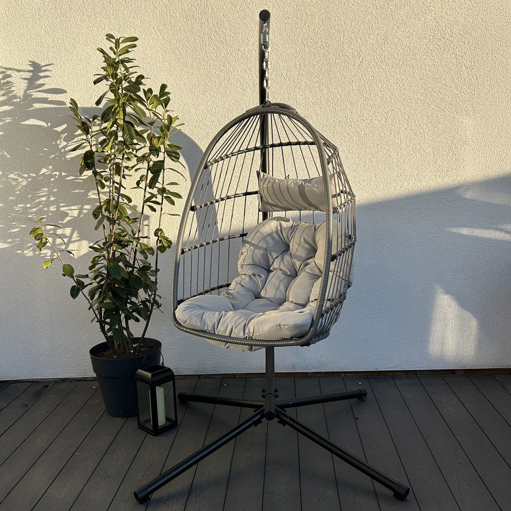 The Azura Foldable Hanging Chair will be a super stylish and comfortable addition to your outdoor space. A cocoon wrapped in rattan hangs from the frame by a chain, which will provide both a calming swinging motion and a quirky visual to your garden. This egg chair is designed with super plush cushions that you can sink into, perfect for enjoying a sunny evening with a good book after a long day at work. The frame of this hanging egg chair is made from strong yet lightweight steel, ensuring it is easy to assemble and will remain strong throughout the summer. A powder coating finish adds a high level of rust resistance to keep it looking sleek and attractive year after year. Cover when not in use.