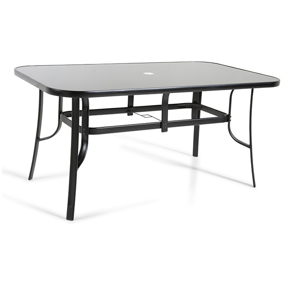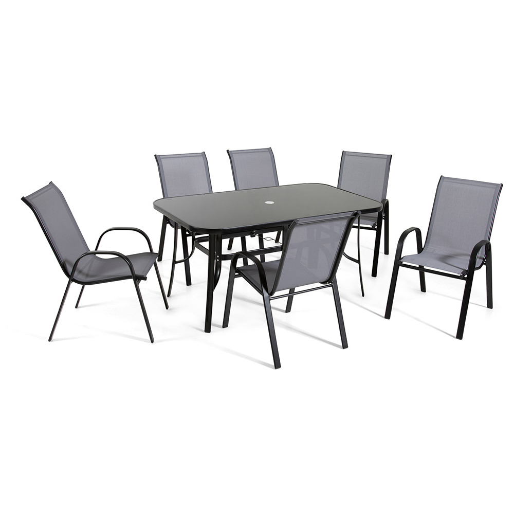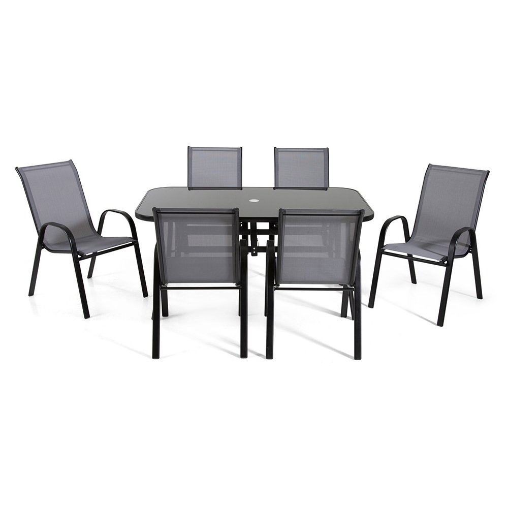 Dine out in style with this attractive Outdoor Living Rufford 6-seater Black and Grey Garden Dining Set. This family-sized set consists of a 150cm wide rectangular table with six stacking chairs in a charcoal grey finish that will complement any home and garden. Durable and sturdy, the table and chairs are crafted from a powder-coated steel frame for durability and weatherproofing in the unpredictable British weather. Plus, the chairs use a textile fabric that's super comfortable to sit on and easy to clean - simply wipe down and you're ready to enjoy a spot of al fresco dining. The table is equipped with toughened black glass, which uplifts the overall appearance of the dining set. The table also features a hole, allowing you to add your favourite parasol. The chairs need to be self-assembled.