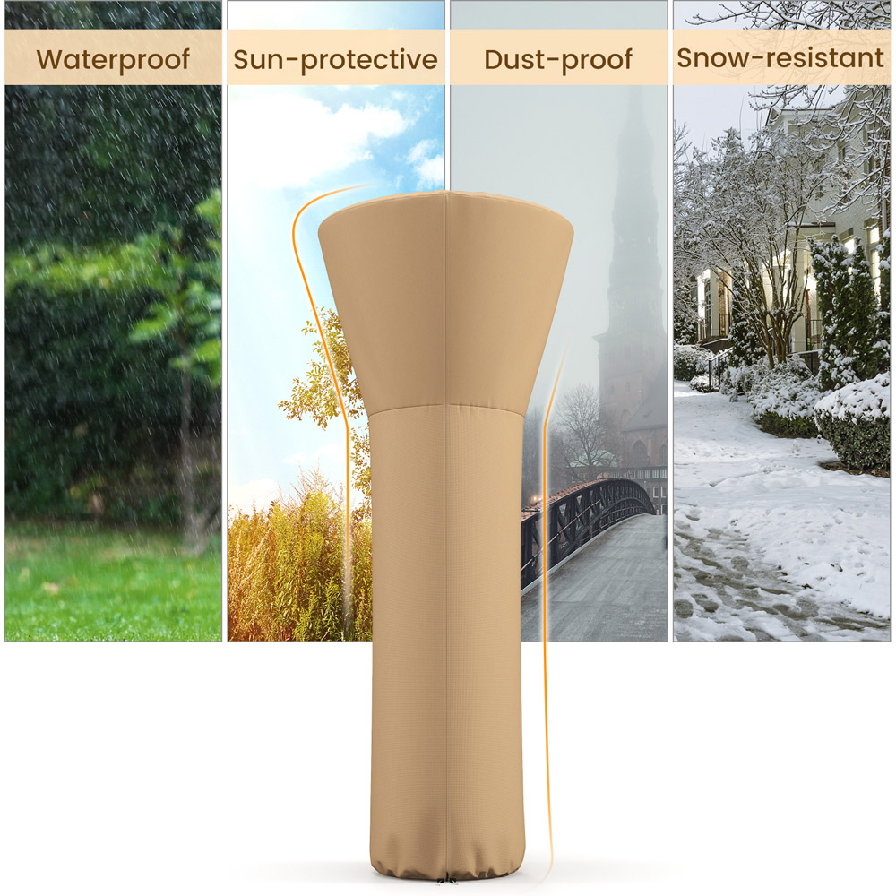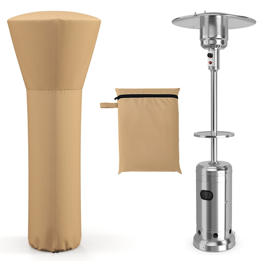 Introducing the Costway Beige Outdoor Patio Heater Cover with Zipper, designed to protect your heater from the elements and keep it in pristine condition year-round. Made from durable Oxford cloth with a waterproof and sun-protective silver coating, this cover offers superior weather resistance. The full-length zipper and adjustable drawstrings ensure a snug fit and easy access, while reinforced seams add extra durability. Measuring 220cm in height, 86cm in top length, and 48cm in bottom length, it fits various patio heaters. The included storage bag provides convenient storage when not in use, keeping everything organized. Note: Hand wash only; not suitable for machine washing or tumble drying.