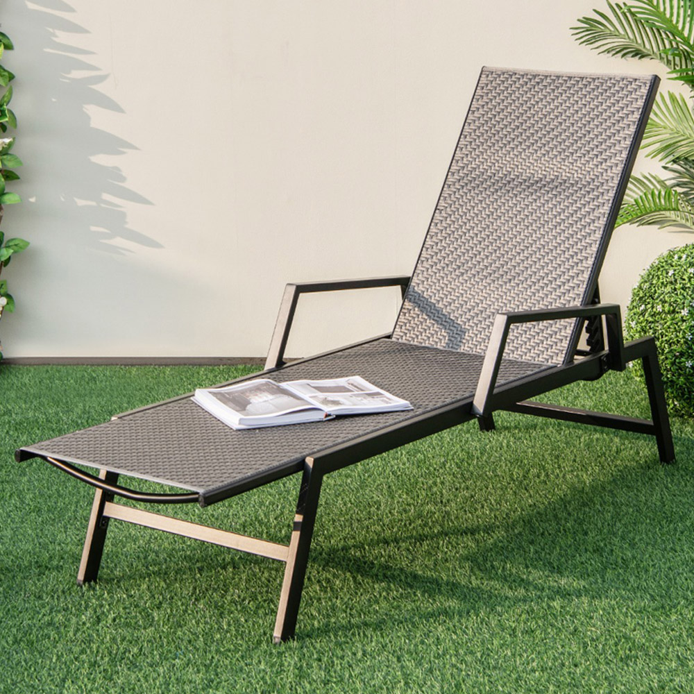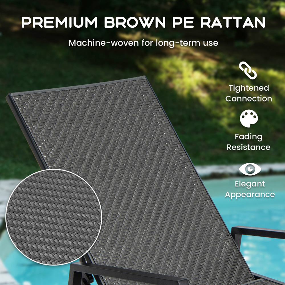 Enjoy ultimate outdoor relaxation with this Costway Brown Outdoor Rattan Chaise Lounge with Armrests. Featuring a 5-level adjustable backrest for perfect positioning whether you're reading, sunbathing, or sleeping, with the option to lie completely flat for maximum comfort. Crafted from durable and appealing brown PE rattan, the seat and back are machine-woven for long-lasting use. The sturdy metal frame with a plastic-sprayed coating ensures stability and support while resisting deformation and rust. The wide seat and cosy armrests provide high-level comfort, making it an elegant and comfortable addition to your backyard or poolside. Overall dimension: H33-93 x W59 x L167-193cm.