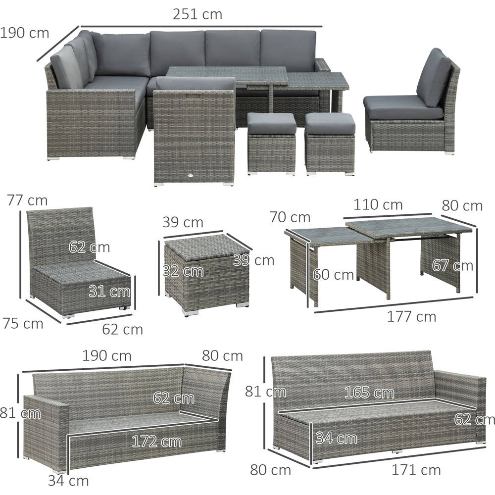 Get the perfect furniture for your outdoor space with the Outsunny 10 Seater Yard Grey Rattan Expandable Sofa Lounge Set. With this patio couch set, you will have ten seats for everyone to enjoy each other's company while eating, catching up, or playing party games. The cushioned seats, which can be easily washed, will make your guests feel comfortable and relaxed. This seven-piece rattan sofa set includes a variety of configurations to cater to any occasion, from board gaming or business talk to family reunions or movie nights. You can place it on your patio, deck, pool, porch, garden, atrium, terrace, or balcony. The expandable centrepiece dining table provides ample space for eating and chatting with friends, and the soft padded cushions will ensure that your guests have the ultimate comfortable outdoor seating experience. Don't forget that the left double sofa feature has a storage function, providing extra storage space for your convenience. Protect your garden furniture with our durable and waterproof covers. Explore our wide range of heavy-duty