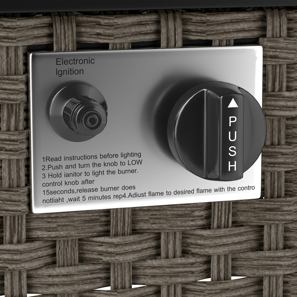 A place to keep warm when sitting with company and a place to enjoy garden warmth and ambience all year-round: this Outsunny rattan fire pit table. The electric ignition system makes it easy to light, powered by LPG or propane gas. The garden table with fire pit featuring a 13 KW burner is powerful and produces a clean, smokeless burn. Complete with a thermocouple to close the valve if the flame goes out for safety, and no leaking gas.