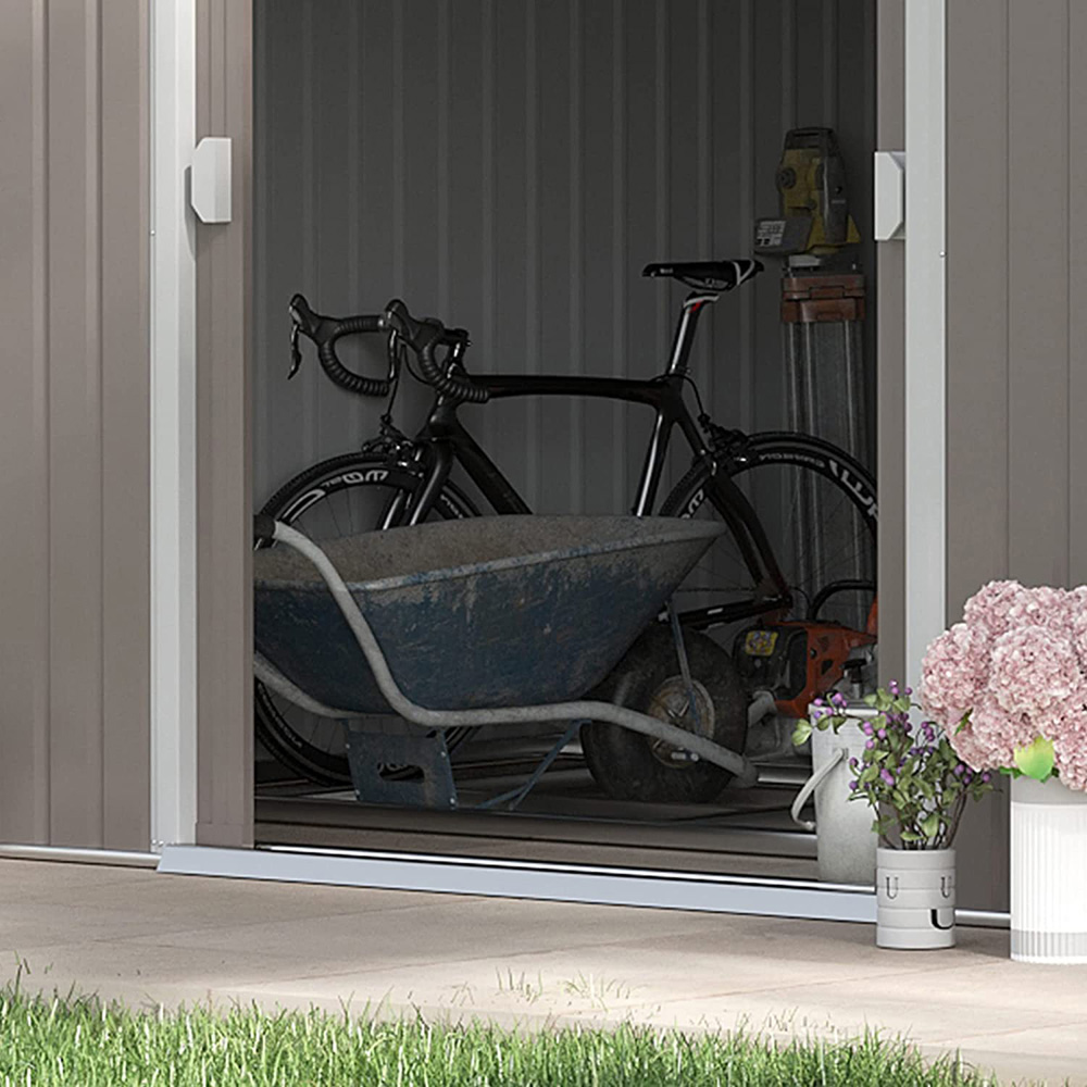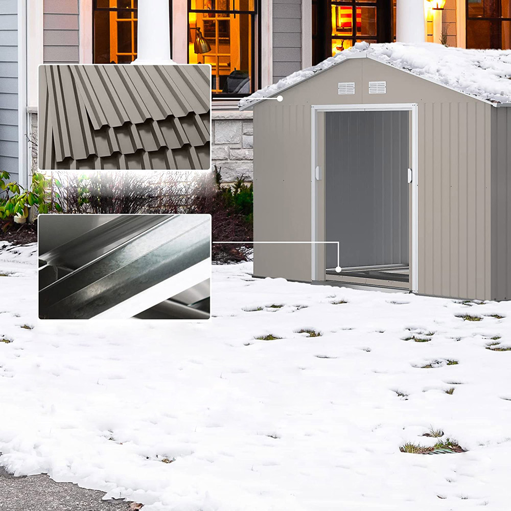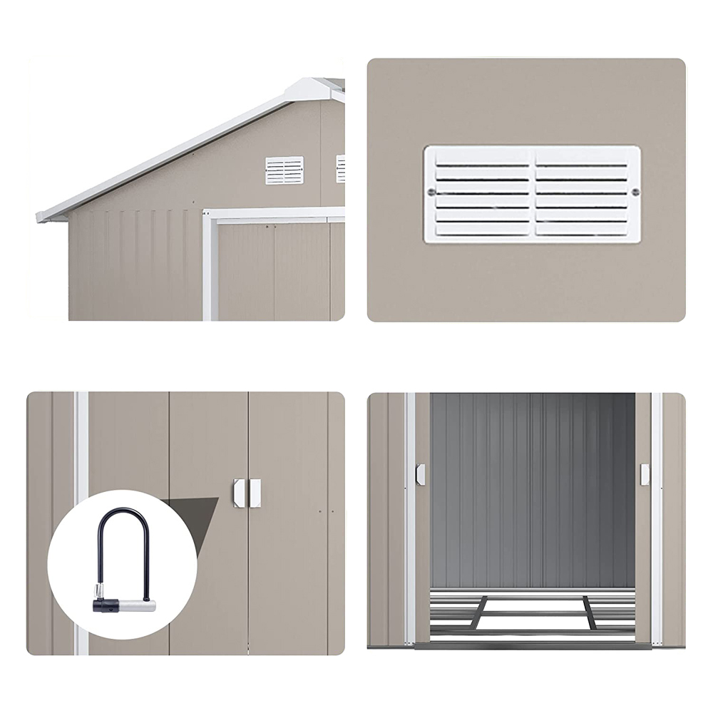 Keep your garden equipment and outdoor essentials locked away securely with metal garden sheds with a base from Outsunny. The garden tool shed has plenty of open storage room for equipment and tools like lawnmowers, grass cutters, chippers etc. It's made from colour steel for enduring reliability. With a sloped roof sitting on the top to help prevent water from stagnating and rust forming, this shed is finished with a protective weather coating and floor foundation, so you have everything you need to install this large garden shed when it arrives. It makes a perfect home for all your outdoor tools and gear. Overall Dimension: H200 x W386 x L340cm. Room Interior Dimension: H200 x W372 x L330cm. Sliding Door Size: H152 x L138cm. Vents Size: W10 x L22cm.