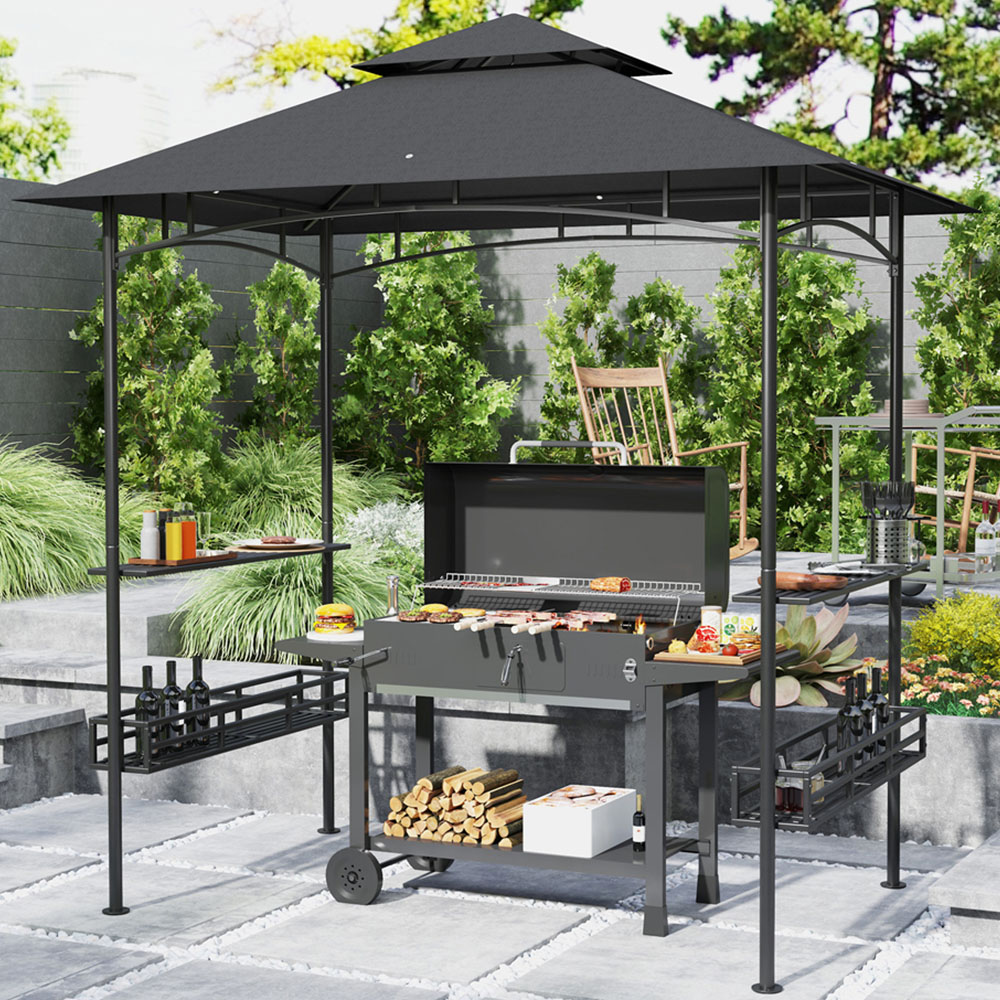 This Outsunny BBQ gazebo is a way to cook outdoors protected and within your own private space. The powder coated and galvanised metal structure means a strong, supportive core, fitted with two side shelves and two baskets to keep plates, utensils and food close by. The polyester canopy on top protects against harsh, damaging sun rays and mild weather, finished with a small top tier to allow air to gently flow out.