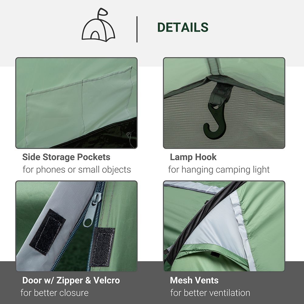 Have fun while camping outdoors with the Outsunny 2-3 Person Tunnel Camping Tent Green. This two-room family tent features a bedroom, living room and front porch ideal for two to three people. You can use the front porch to relax while enjoying the weather or keep your outdoor accessories. This tunnel tent includes a rainfly cover for extra protection with side storage pockets, a lamp hook and mesh vents for air circulation. It is crafted using sturdy fibreglass poles that provide an upright and stable structure. It also includes a carry bag for convenient portability while travelling. Please note: This tent is not suitable for use in extreme weather, snow or extremely low-temperature climates.