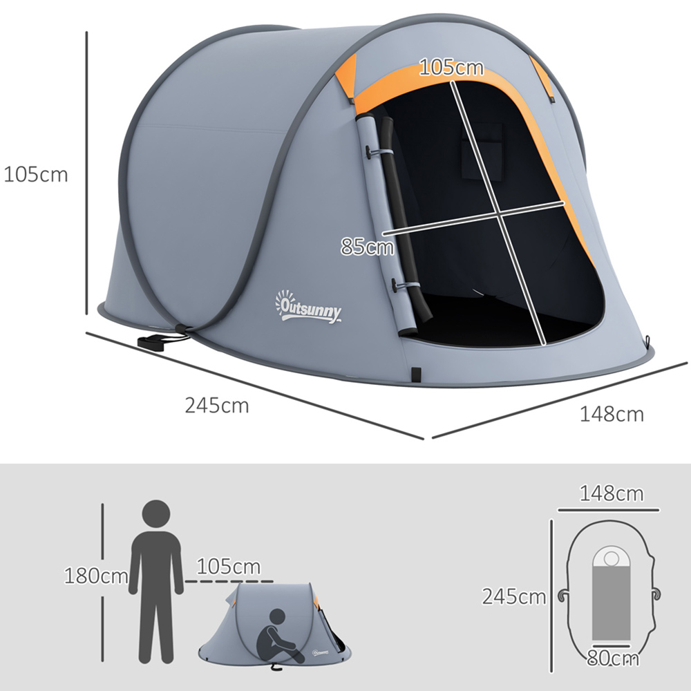 Explore the great outdoors with the Outsunny 2 Person Waterproof Camping Tent Grey and Orange. The tent is perfect for day trips, overnighters, and beginner-level backpacking trips. It comfortably houses two people, making it perfect for family trips and adventures with friends. With a 2000mm waterproof fabric shell, you'll stay dry and protected from mild outer weather. The inner floor keeps you dry, and the pop-up design makes this lightweight tent easy to assemble and pack away, taking the stress out of your camping experience. Plus, the large door provides easy access, and the mesh window ensures you stay cool and comfortable. So why wait? Get your instant pop-up tent today, complete with a convenient carrying bag, and start your adventure.