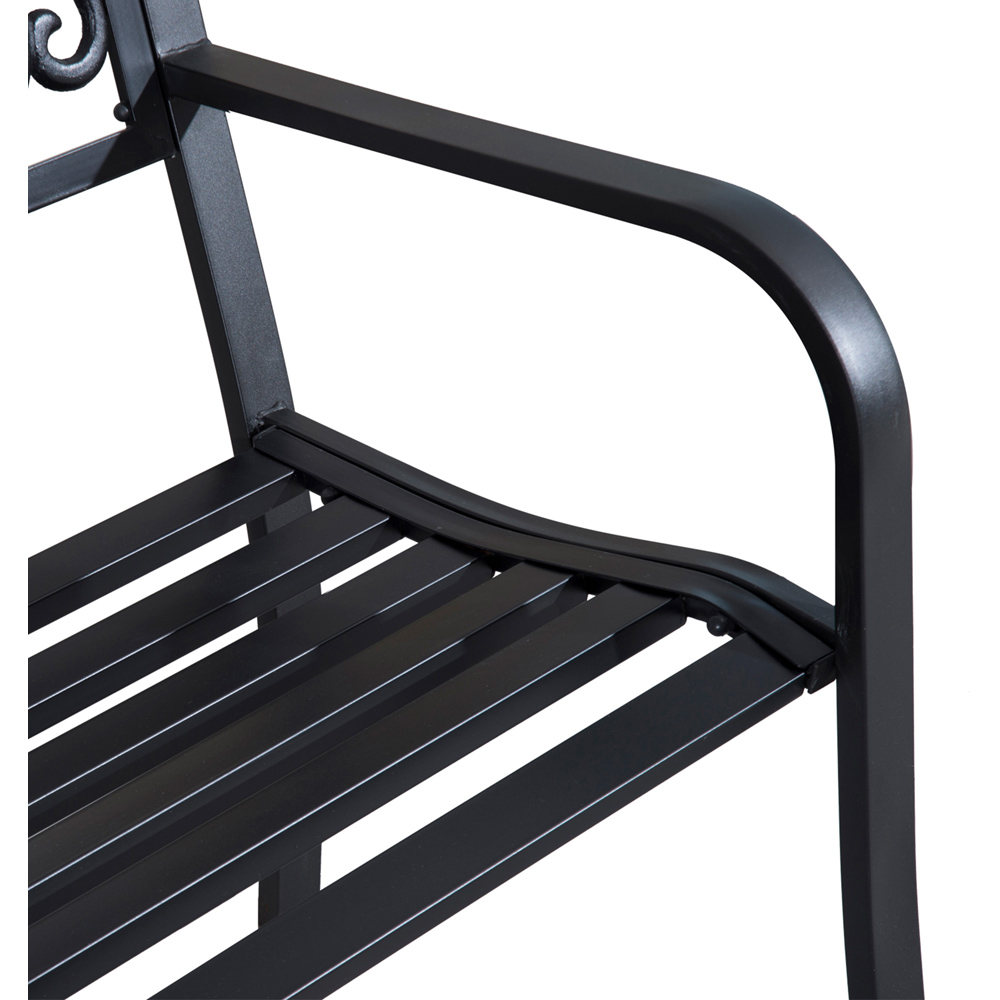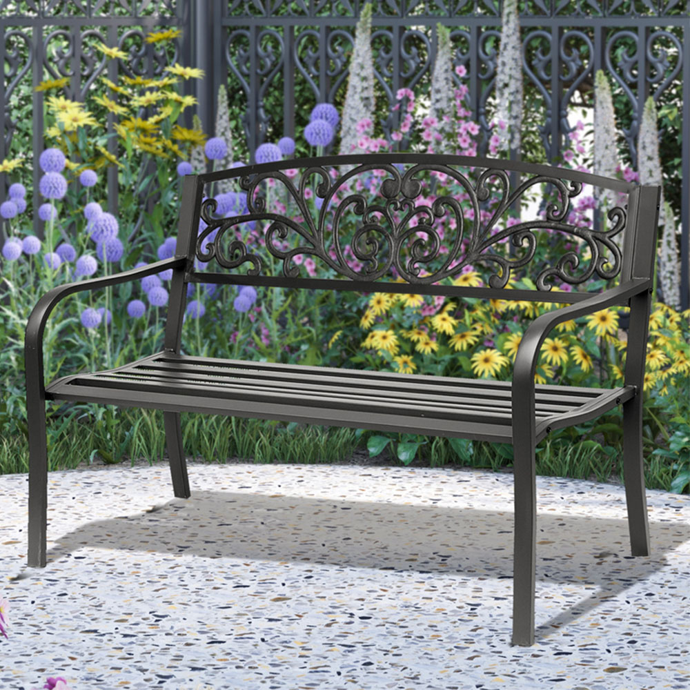 This garden bench from Outsunny is ideal for enjoying your favourite peaceful spot, along a path, under a tree, or among the flowers. It is constructed with a steel frame in black to make it both stylish and durable. Its 120cm length allows for two individuals to comfortably sit and relax at once. Beautifully designed with powder coating, the bench features a floral design on the backrest to complement your outdoor décor in style. Pretty and practical, it offers a comfy place to relax with friends or family and enjoy the scenery of your outdoor space. Protect your garden furniture with our durable and waterproof covers. Explore our wide range of heavy-duty Garden Furniture covers to find the perfect fit for your needs.
