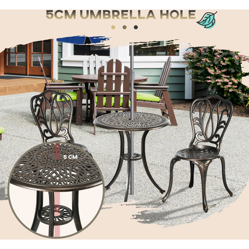 Add a touch of elegance to your outdoor areas with this Outsunny 2 Seater Garden Bistro Set in a classic bronze tone. The set includes two chairs and a matching table. The table top features a centre umbrella hole to hold a parasol in place. The set is made from aluminium for strength and features decorative patterns for a stylish look. The frames have a strong powder-coated finish with anti-rust and water-resistant properties. The adjustable foot pads keep the outdoor table and chairs stable. Protect your garden furniture with our durable and waterproof covers. Explore our wide range of heavy-duty Garden Furniture covers to find the perfect fit for your needs.