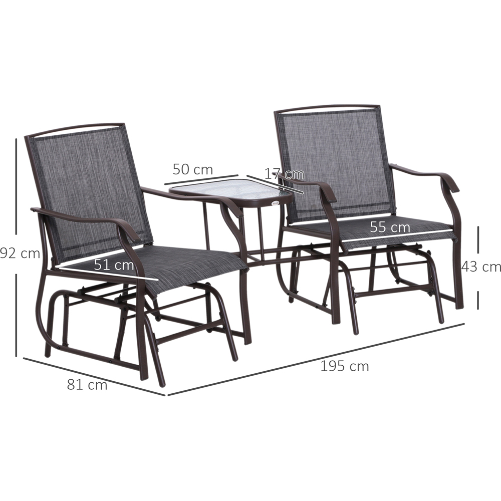 Upgrade your outdoor space with the Outsunny 2 Seater Grey Rocking Companion Seat. Made from steel for strength, reliability, and long-term use, the seat features a mesh cover to keep you comfortable, allowing your skin to breathe all day long. Made from glass, not only is the table perfect for keeping drinks, books, and food conveniently close to hand, but it also is easy to clean and maintain. Whether it's for relaxing with a friend or by yourself, this glider bench is perfect for taking a well-deserved rest. Protect your garden furniture with our durable and waterproof covers. Explore our wide range of heavy-duty Garden Furniture covers to find the perfect fit for your needs.