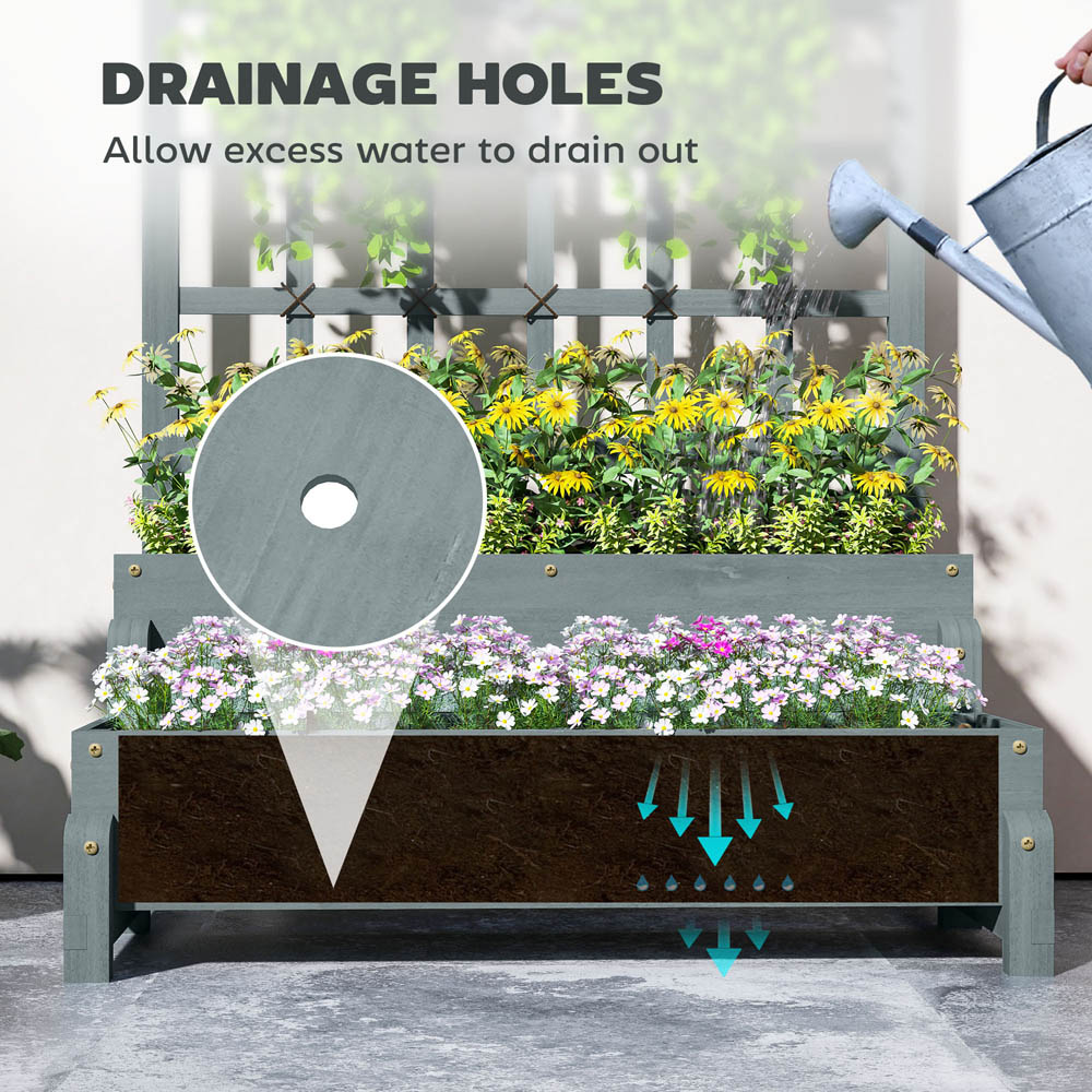 Discover the charm of the Outsunny wooden planter with its clever 2-in-1 design. This raised garden planter features a spacious planter box and a built-in trellis for your climbing plants. Enjoy easy gardening without the strain, thanks to its elevated structure, while the drainage holes and natural fir wood construction ensure your blooms thrive.