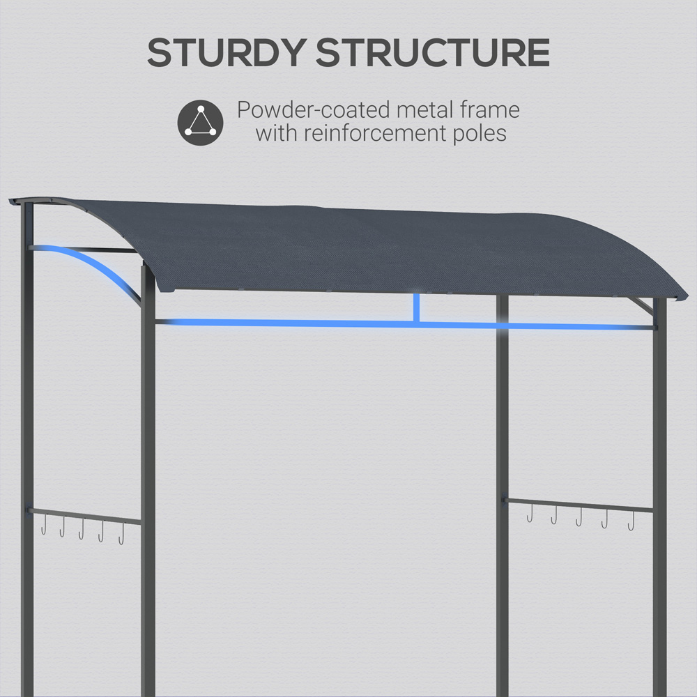 Protect your BBQ grilling activities throughout the summer with the Outsunny 2m Grey BBQ Grill Gazebo Tent with Hooks. Constructed with a sturdy metal frame and a top canopy, this smoking shelter offers ample space for you to work comfortably. Its mild-weather protective room allows you to cook up a storm for your family and friends. Equipped with ten inner hooks (five on each side), you can conveniently hang utensils and other cooking tools. The curved roof design helps to prevent excessive smoke build-up inside the shelter. Additionally, the set includes ground pegs to securely anchor it to the ground. With a generous size of 215cm x 150cm, the metal frame provides plenty of room for your BBQ and allows you to move around freely. It is suitable for wide grills up to 110cm. The curved canopy, made of water-resistant polyester, ensures a safe BBQ shelter even in light to medium weather conditions. Its outward-facing shape promotes inner airflow, effectively pushing smoke outwards and keeping the inside clear.