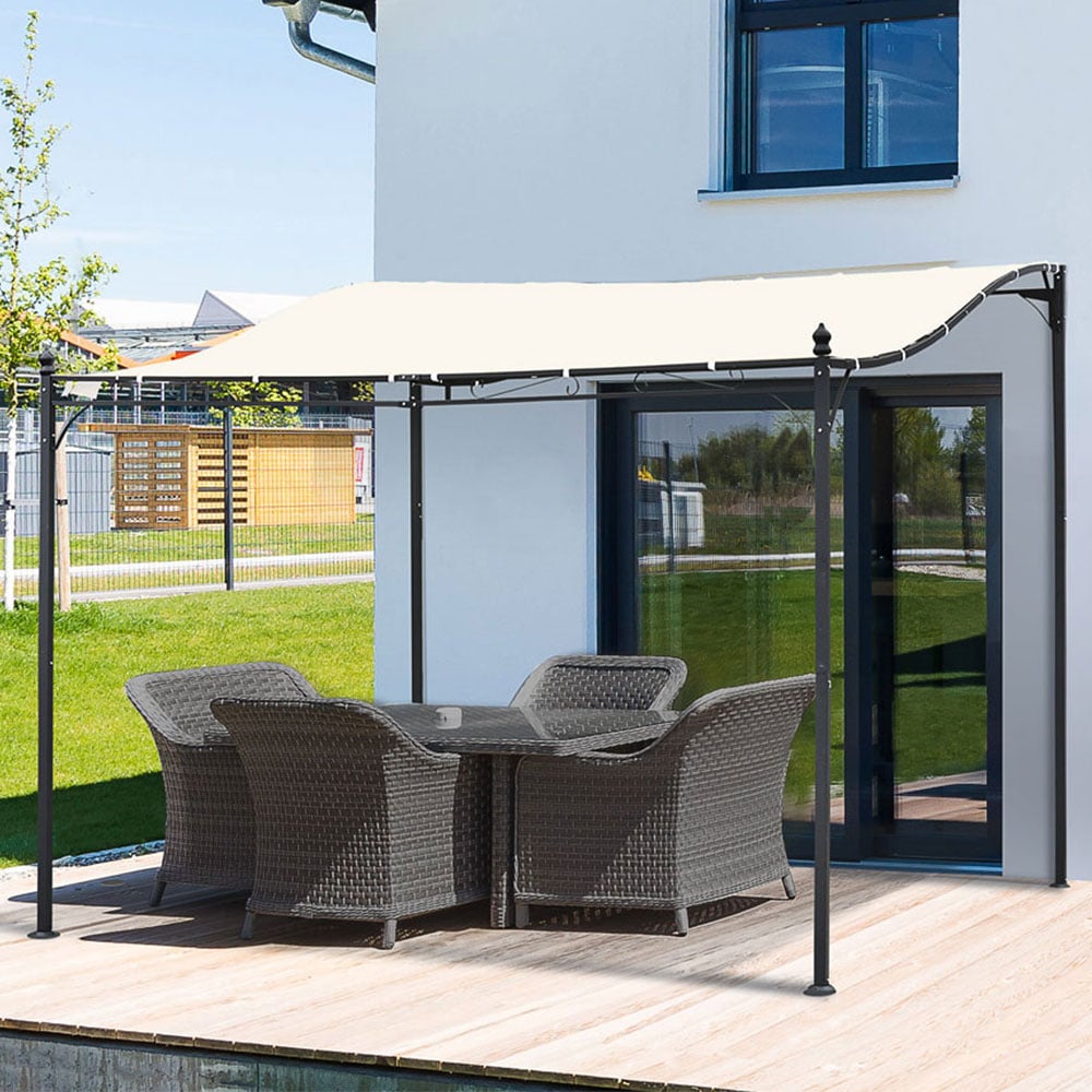 Enjoy outdoor gatherings with your loved ones with the Outsunny Elegant Pergola Gazebo. It is crafted into a 250 x 297cm design, consisting of a taller back and short front. With a, waved connecting frame covered with a top 180gsm polyester canopy - it provides shelter against direct sunlight. The elegant scroll design on the front and the wall-mounted canopy are finished with 16 drainage holes on the top to prevent water accumulation and eight ground stakes to pin to the ground.