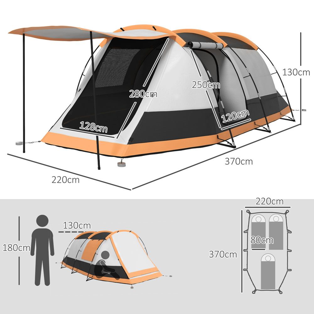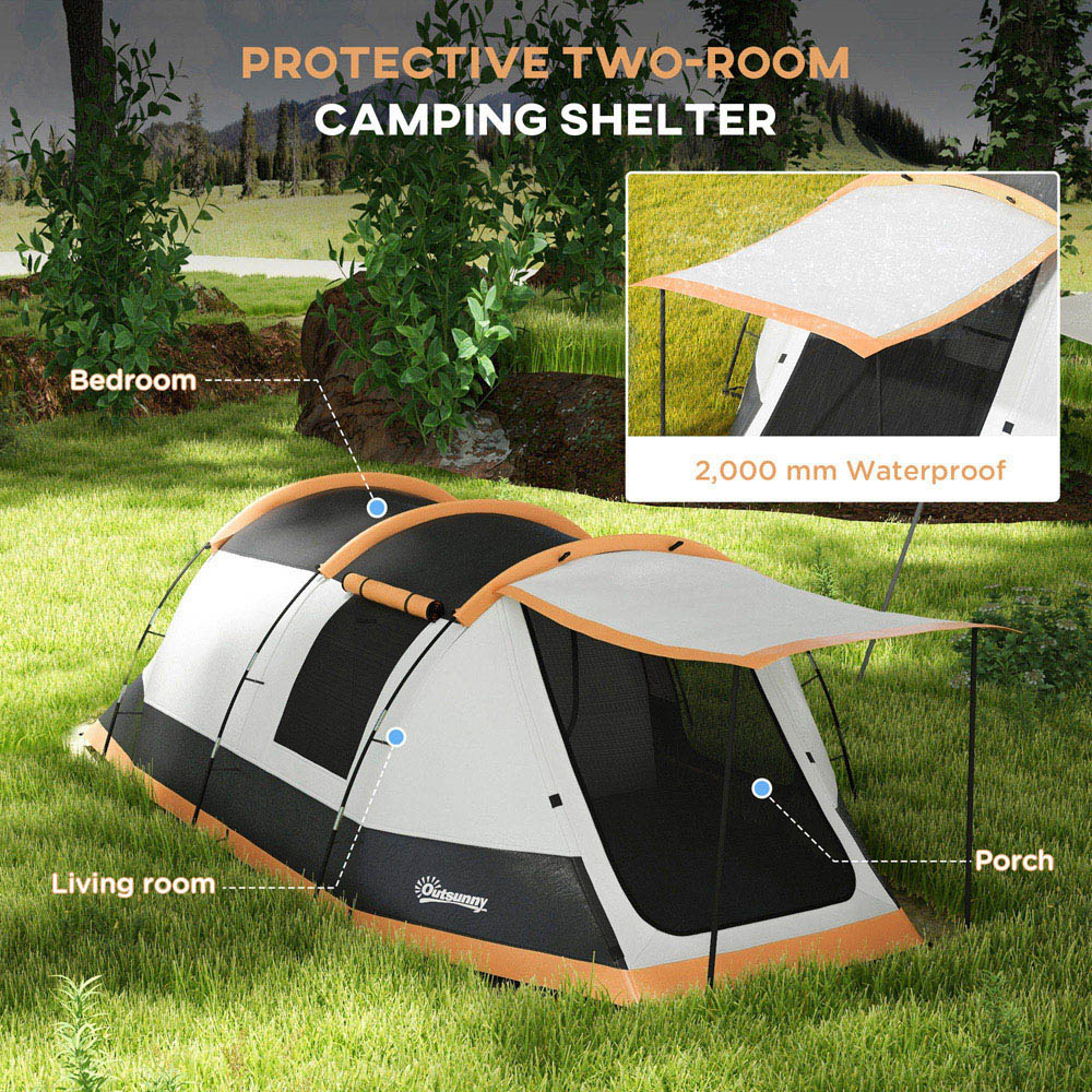 Enhance your outdoor camping shelter with the Outsunny 3-4 Person Waterproof Tunnel Camping Tent Orange. This two-room family tent comes with a porch, a bedroom and a middle living room, ideal for three to four people. This lightweight tent features two zipped doors with two windows for fresh air circulation. This tunnel tent has a sewn-in floor and features a 2000mm water-resistant shell. It is crafted using a sturdy fibreglass pole structure that stands upright and stable with the help of 8 guy ropes and 18 ground stakes that can be secured to the ground. It also includes a carry bag for convenient portability while travelling.